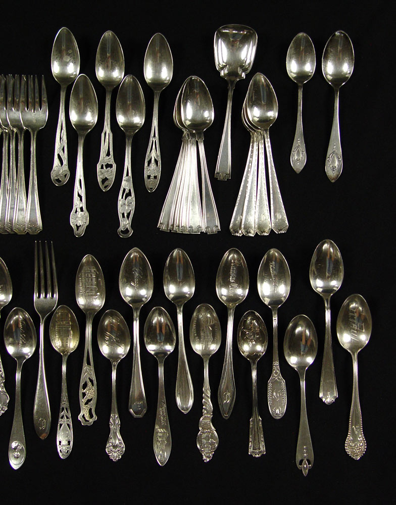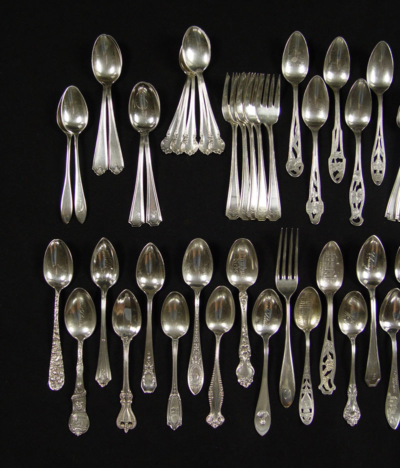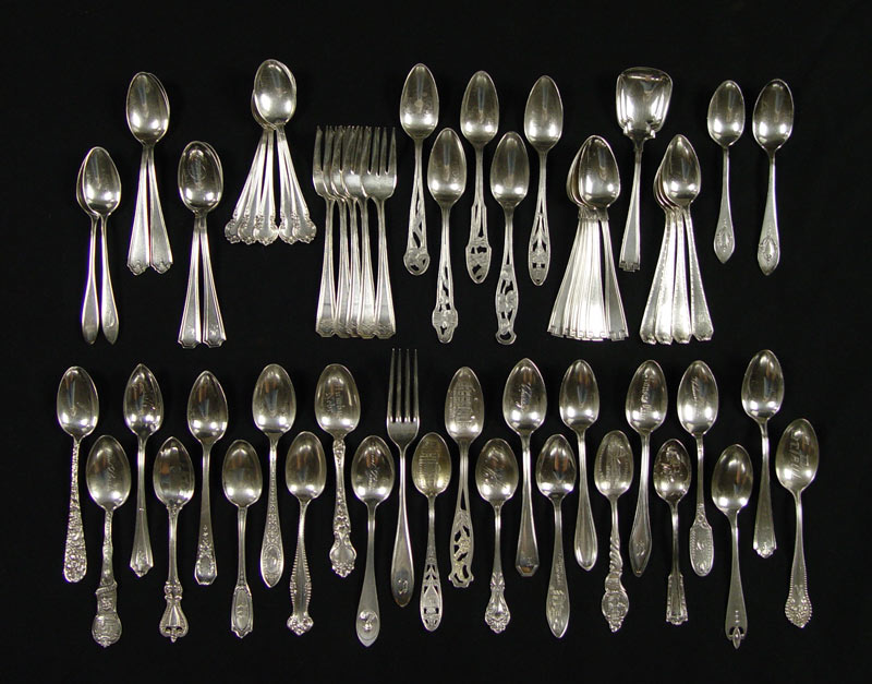 ESTATE COLLECTION OF STERLING FLATWARE: Approx 63 pieces in assorted patterns and various makers. Includes souvenir spoons, Gorham, Whiting, Wallace, Steiff, Dominick & Haff, and more. Approx 44.2 troy oz.