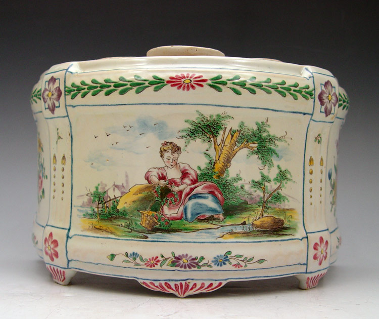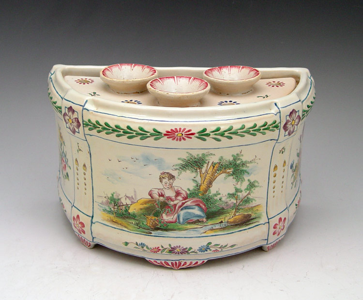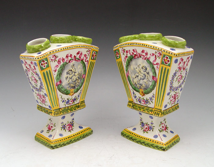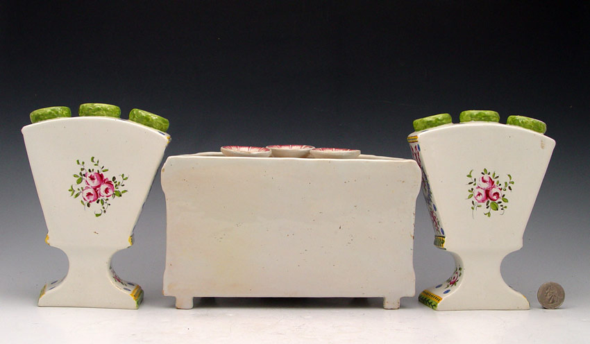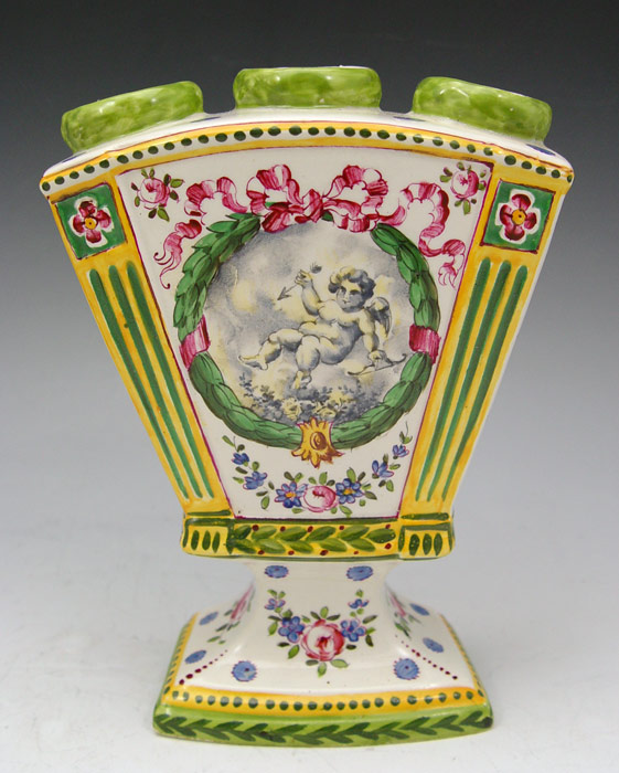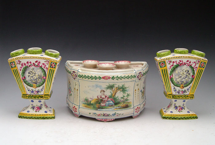 3 PIECE SCEAUX FRENCH FAIENCE TULIPIERES: Center demi vase, 5'' x 8 3/4'', joined by a pair of fan vases, 6 3/4''h.