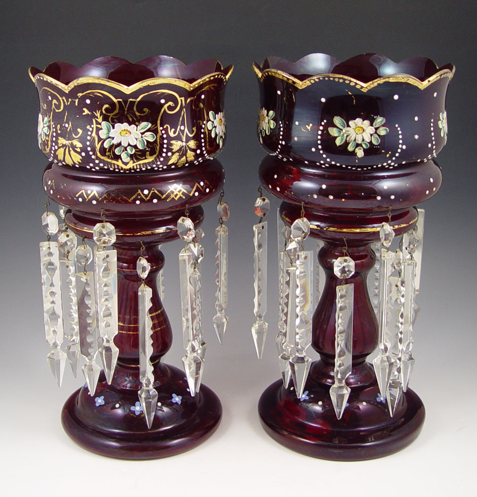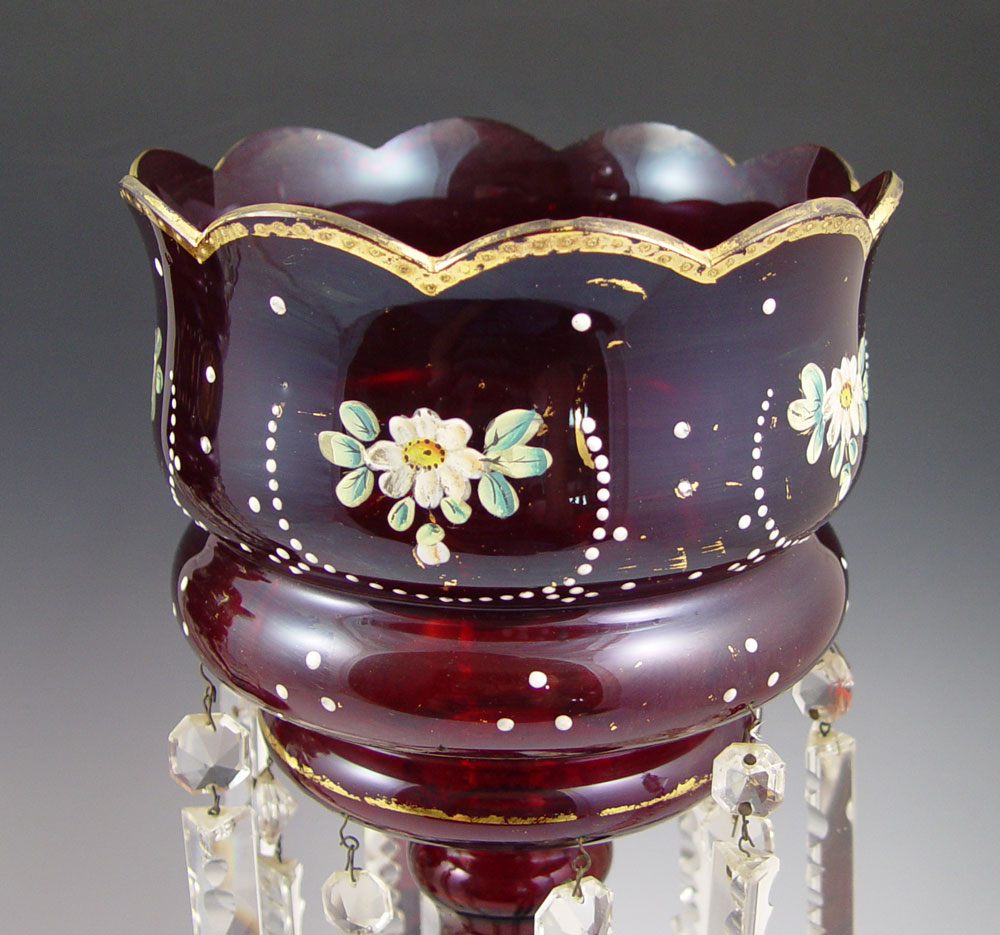 ENAMEL AND GILT DECORATED RUBY GLASS LUSTERS: 13 3/4''h. Accompanied with candle holder insert. Please note there is gold loss to one.