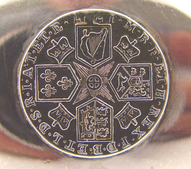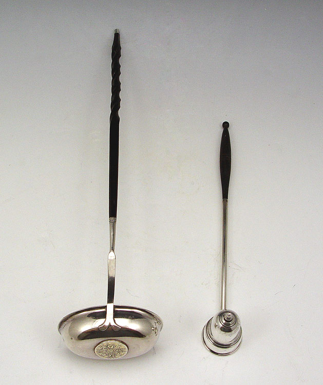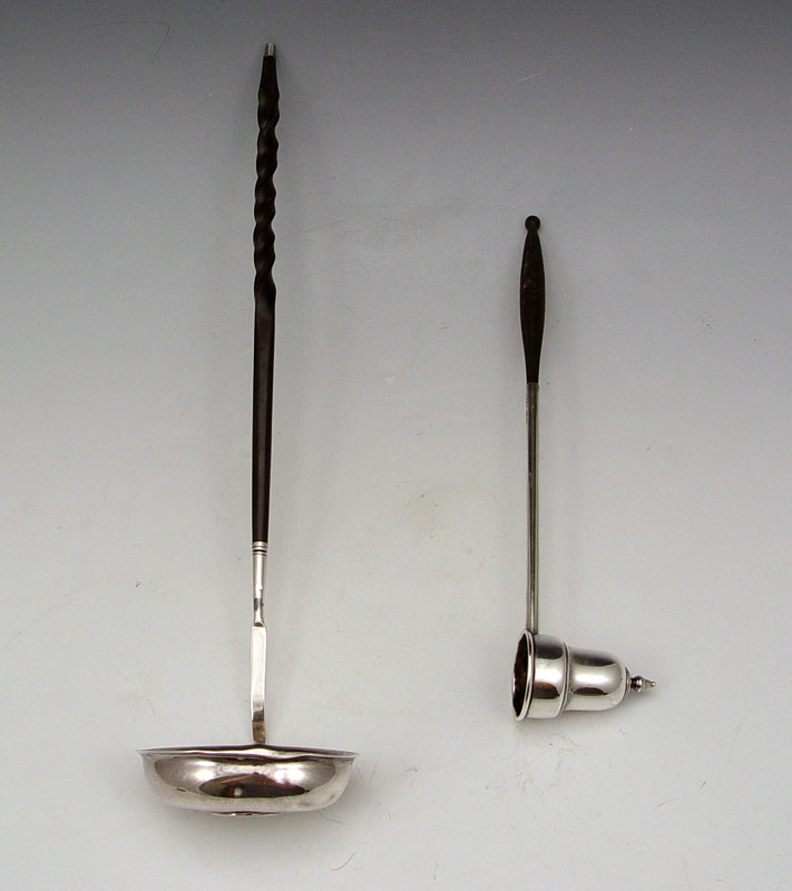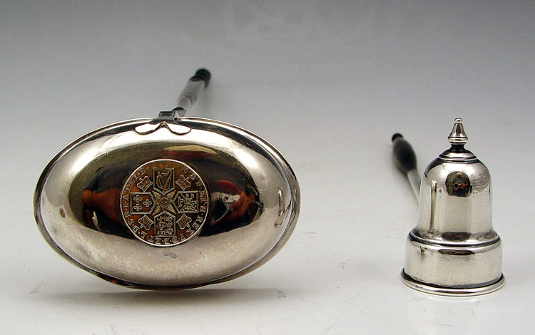 COIN INSET BALEEN HANDLE LADLE AND STERLING SNUFFER: To include 1) Unmarked silver ladle with George III inset coin and baleen handle with twist. 13 1/4'' long. Note unknown metal content. 2) Sterling candle snuffer, marked Sterling G681 with rounded baleen handle. 9 1/4''.