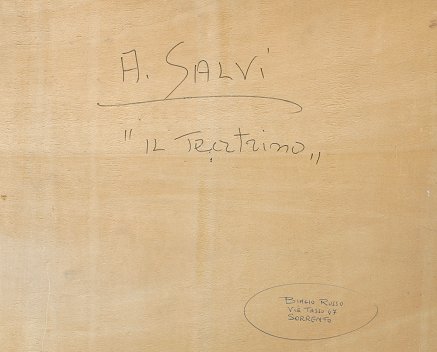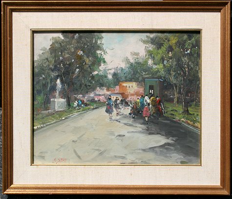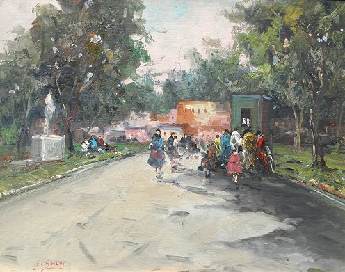 SALVI, A., (Italian, 20th C.): Street Scene with Figures, Oil/Board, 16'' x 20'', signed, titled verso, ''Il Teatrino'', gilded frame with fabric liner, 21 1/2'' x 25 1/2''.