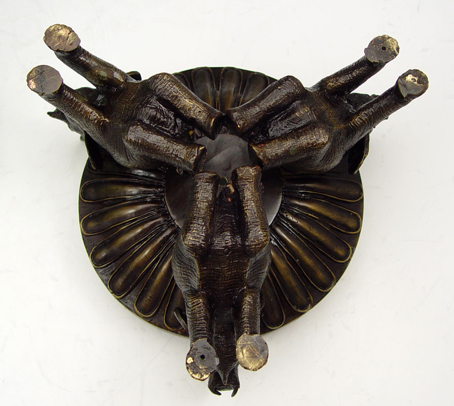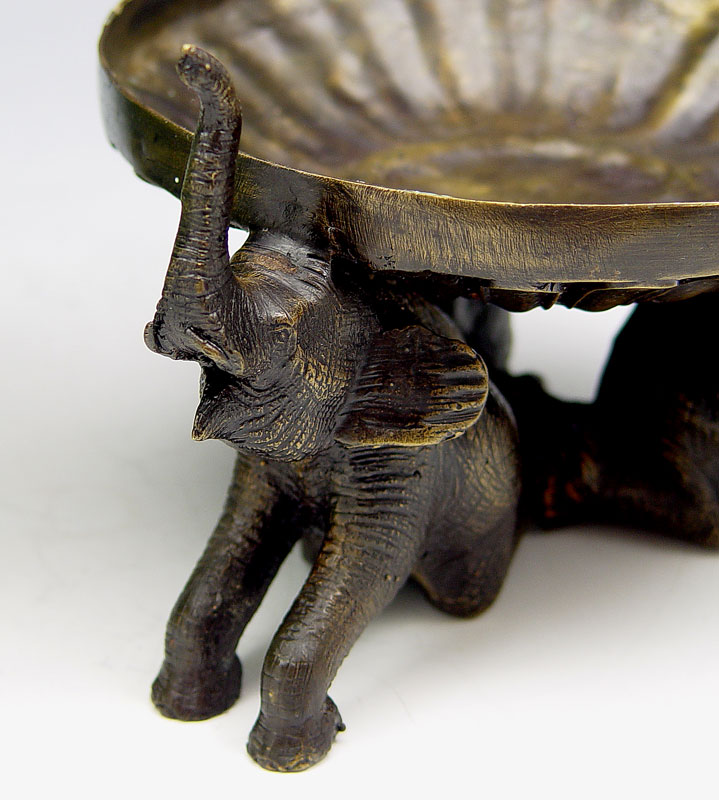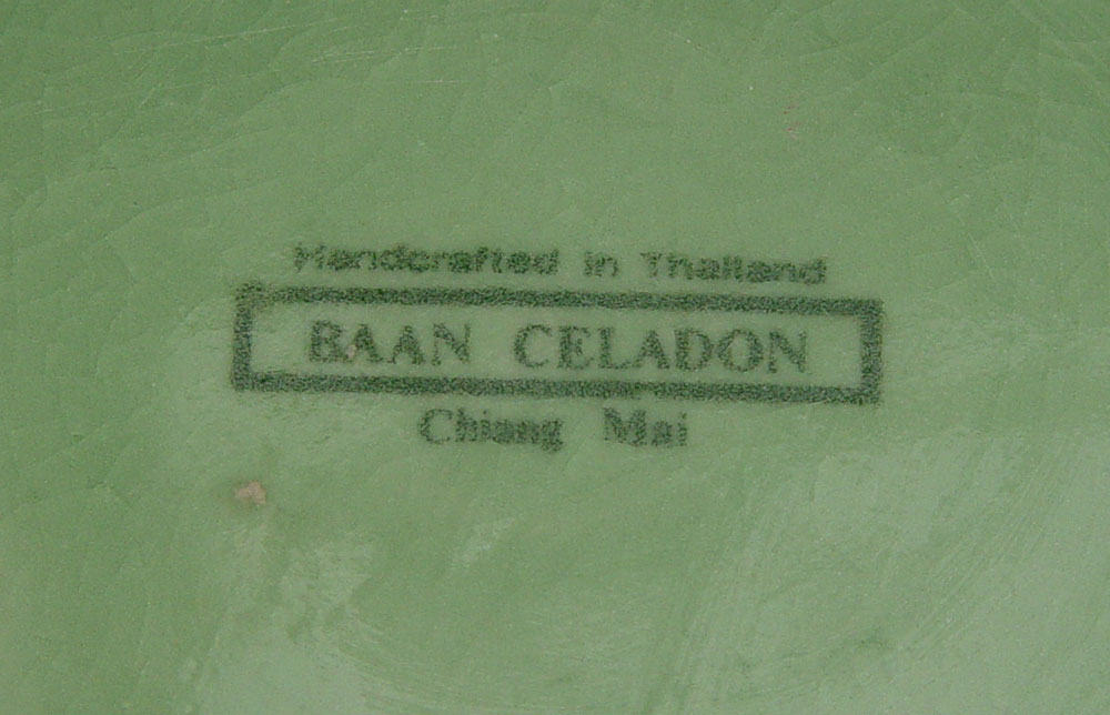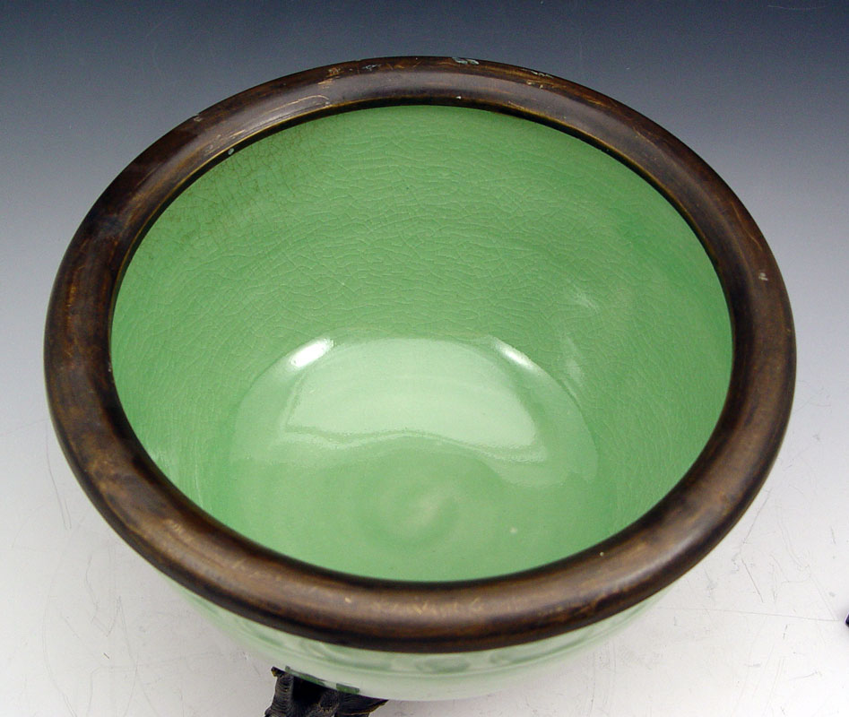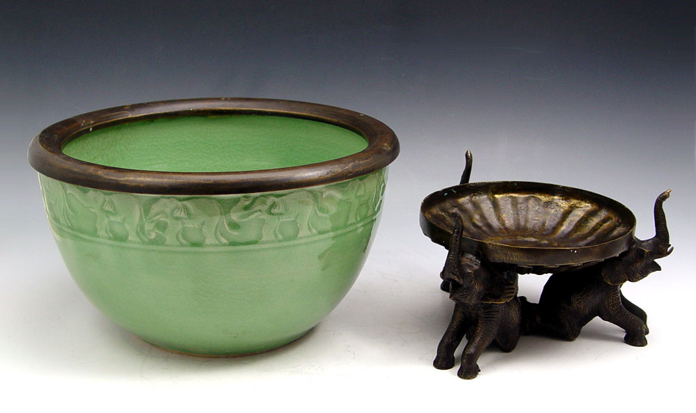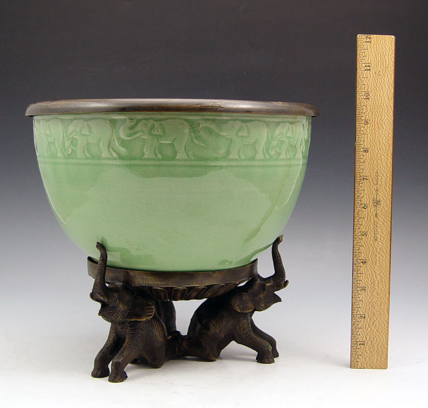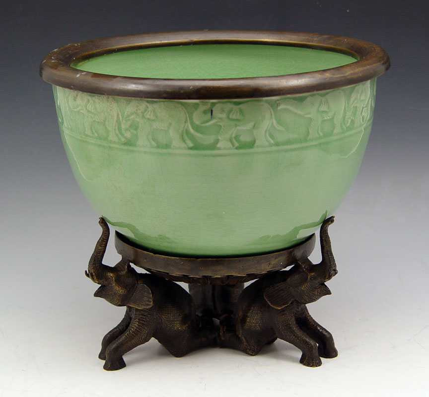 ELEPHANT EMBOSSED BAAN CELADON JARDINIERE ON STAND: Baan Celadon, Chiang Mai, Thailand. Metal rimmed jardiniere with frieze of elephants along the rim. 6 1/2''h. x 10 3/4'' dia. The figural base is a trio of elephants, adds an additional 4'' to the height.
