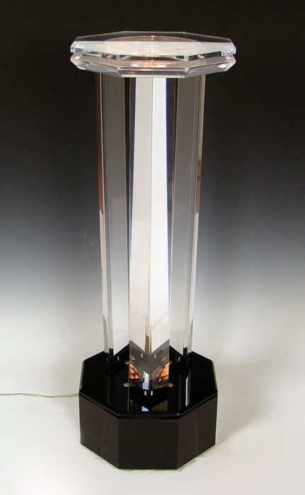 ACRYLIC 3 COLUMN PEDESTAL: Illuminated upward from the base, octagonal top 40''h. x 14'' dia. The optional use spinning platform adds another 1 1/2'' to the height.