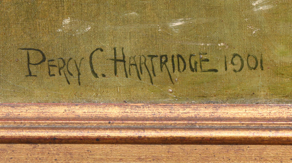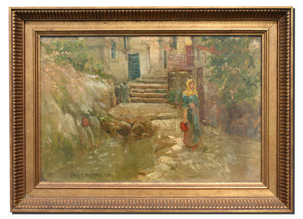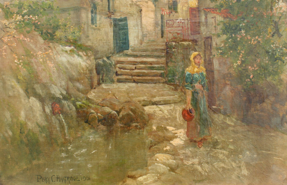 HARTRIDGE, Percy, (American, 19/20th C.): Female Figure at the Village Well, Oil/Canvas, 12'' x 18'', signed and dated 1901, framed, 16'' x 22''.