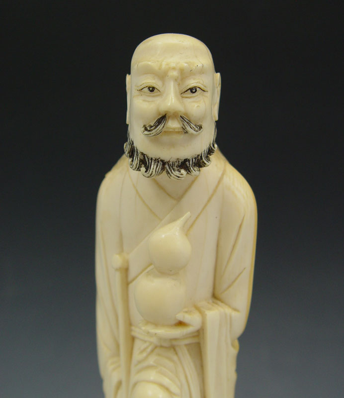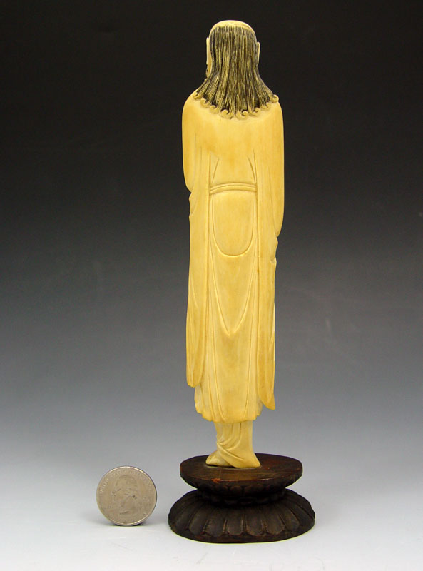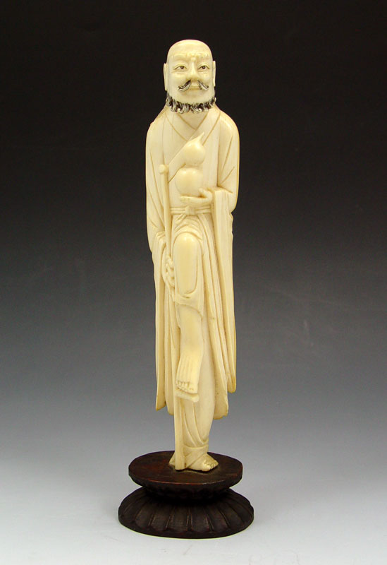 ASIAN CARVED IVORY FIGURE: Solitary bearded man with foot raised. The ivory is 7'' tall. The wood base adds an additional 1''.