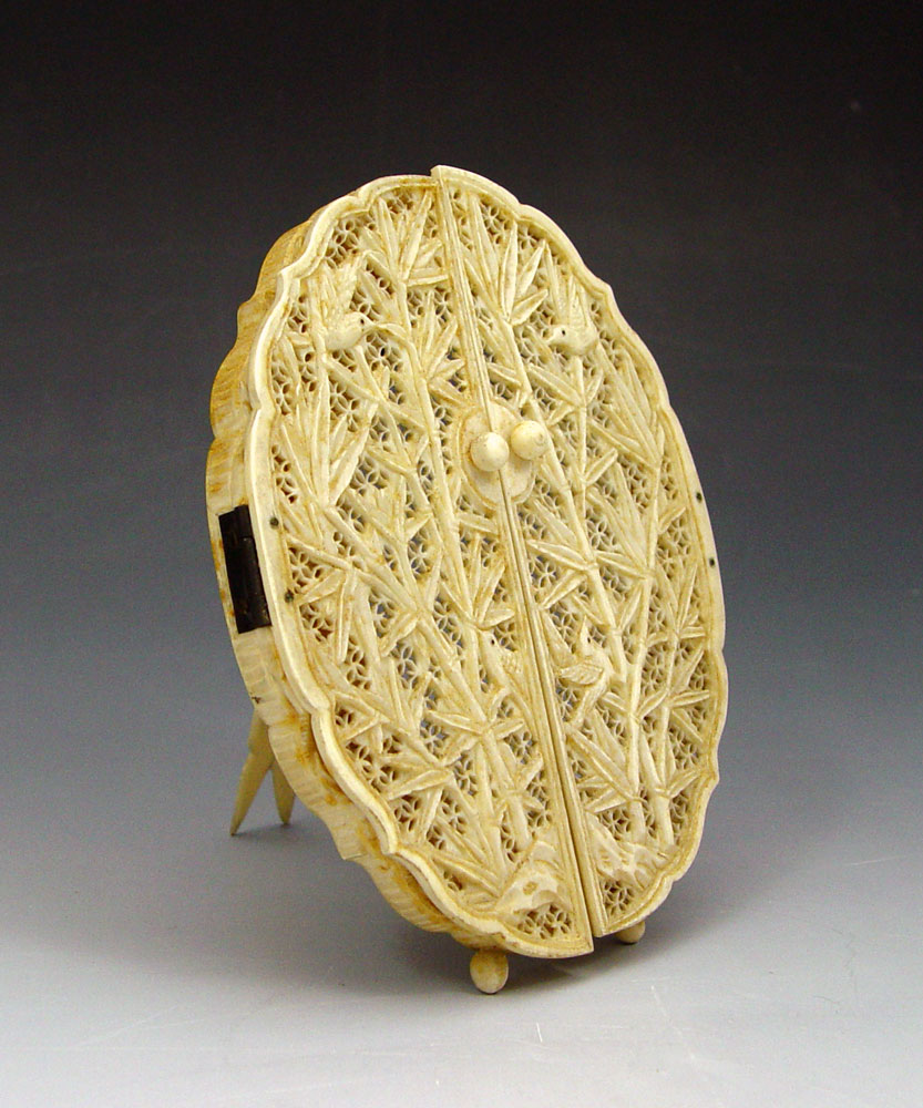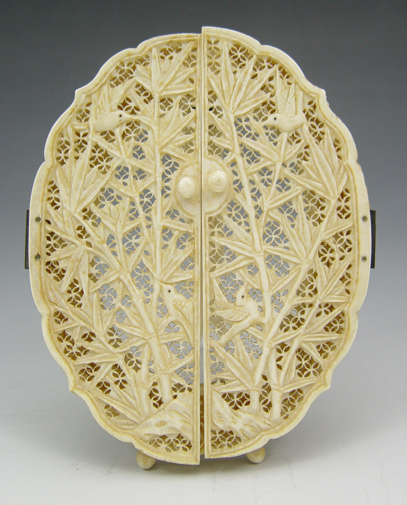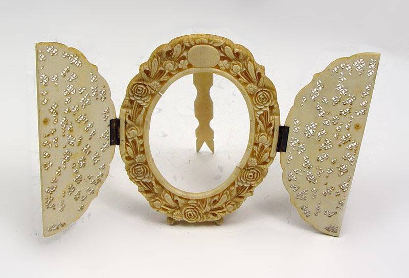 CARVED IVORY PICTURE FRAMES: Easel back frame with pierced and carved hinged cover. Ball feet. 4 1/4'' x 3 1/4'' overall.