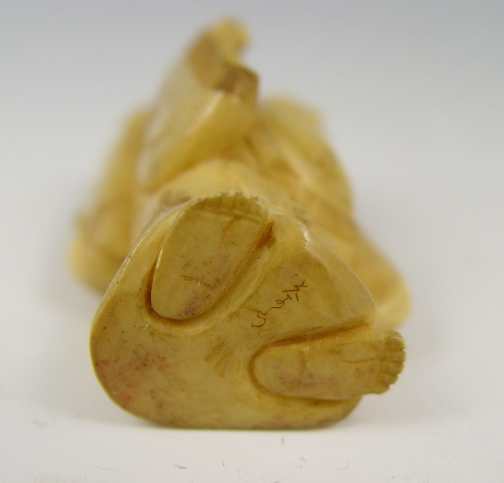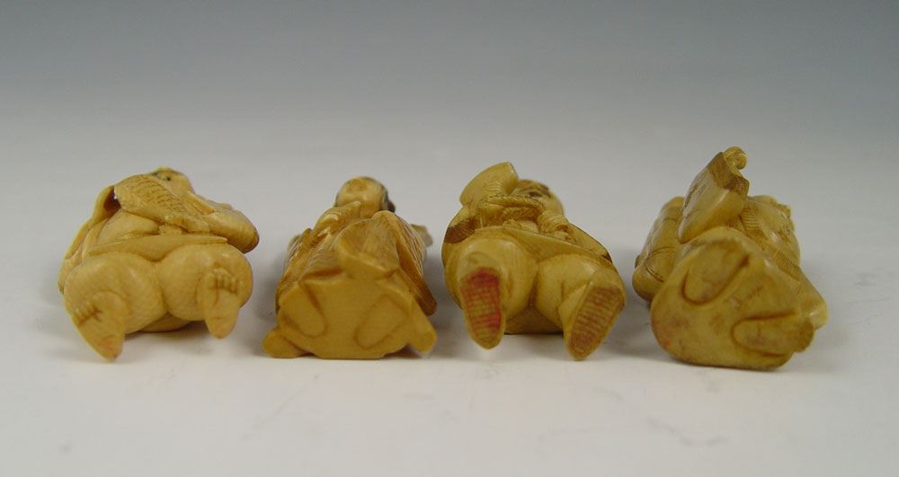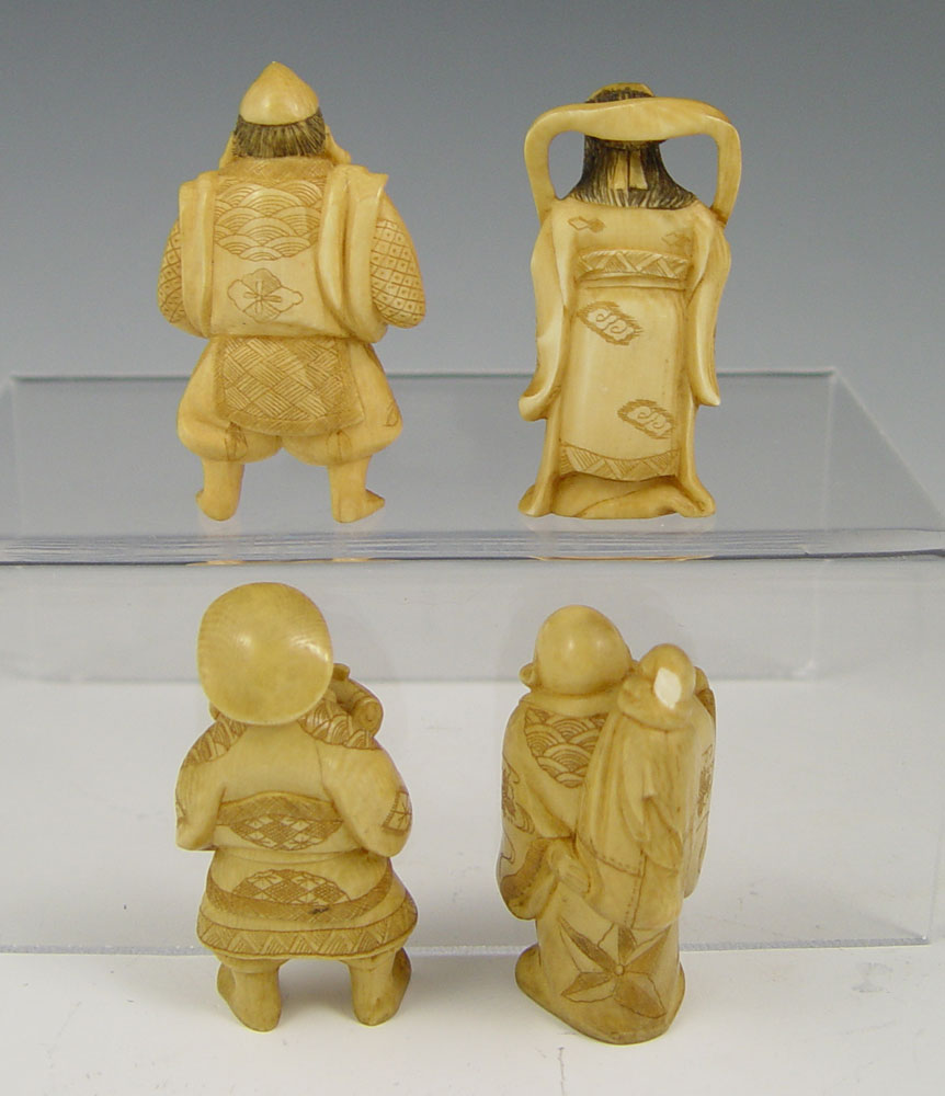 COLLECTION OF 4 CARVED IVORY OKIMONO: To include 1) Man with hammer / tool, unsigned, 2 1/4'' h. 2) Woman with cup, unsigned, 2 1/8''. 3) Man with fish, unsigned, 2 1/2'' 4) Man with satchel, unsigned, 2 1/8''.