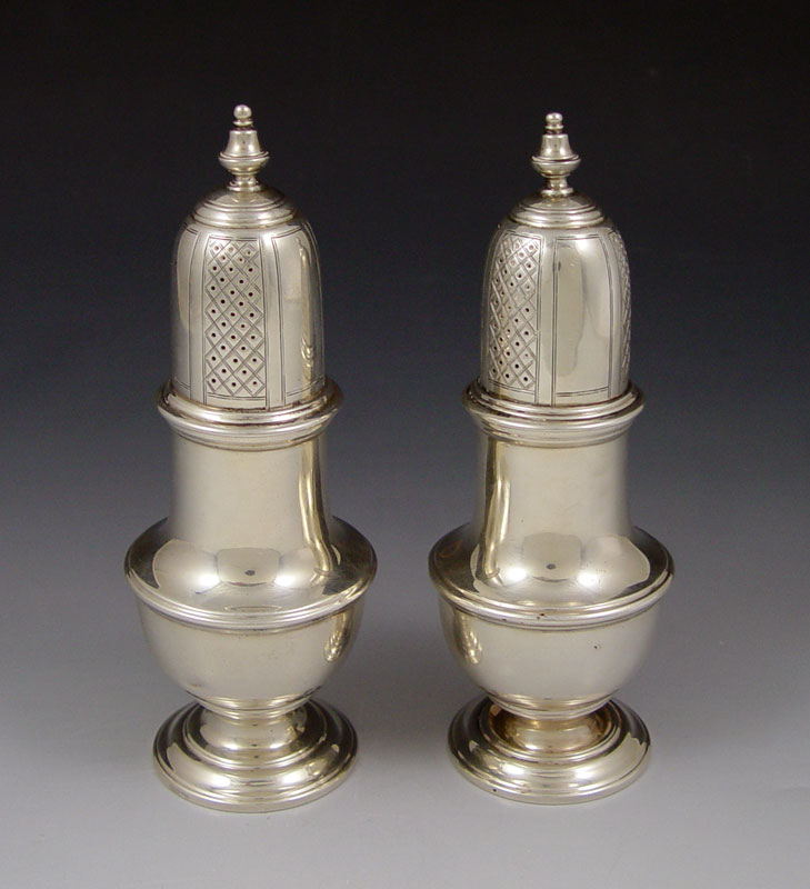 PAIR TIFFANY RETAILED ENGLISH SILVER MUFFINEERS: Hallmarked Ellis Jacob Greenburg, London 1930. Marked on base Tiffany & Co. England. 5 3/4'' h. x 2 1/4'' dia. Approx. 9.5 troy oz.