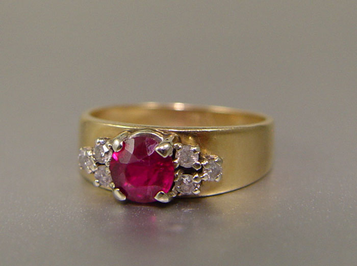 VINTAGE 14K RUBY & DIAMOND RING: 14K yellow gold ring contains one 5.50 mm synthetic ruby. Framed by six round full cut diamonds. Weight: .12 Ct. Approx. Rated I1 in clarity and I-J in color. The ruby and diamonds are prong set. Weight: 3.2 grams. Size: 6