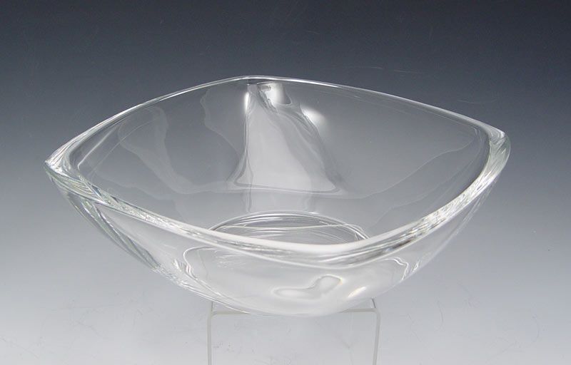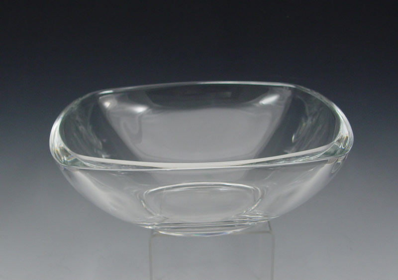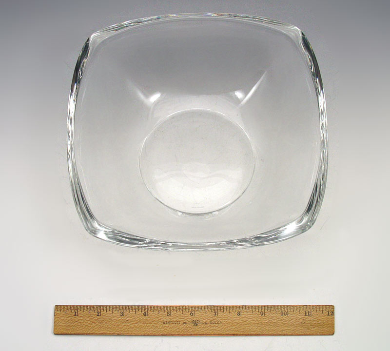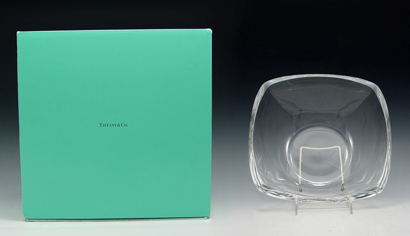 LARGE TIFFANY & CO. CRYSTAL BOWL WITH ORIGINAL BOX: Center bowl, Tiffany & Co. mark. Bowl measures 3 1/2'' x 10 1/4'' square. Sold with original blue Tiffany box and bag. Box measures 8 1/2'' h. x 12 1/4'' square.