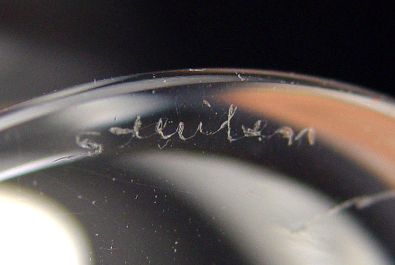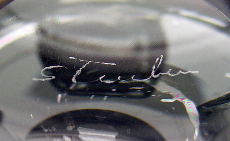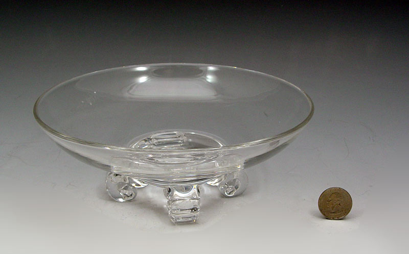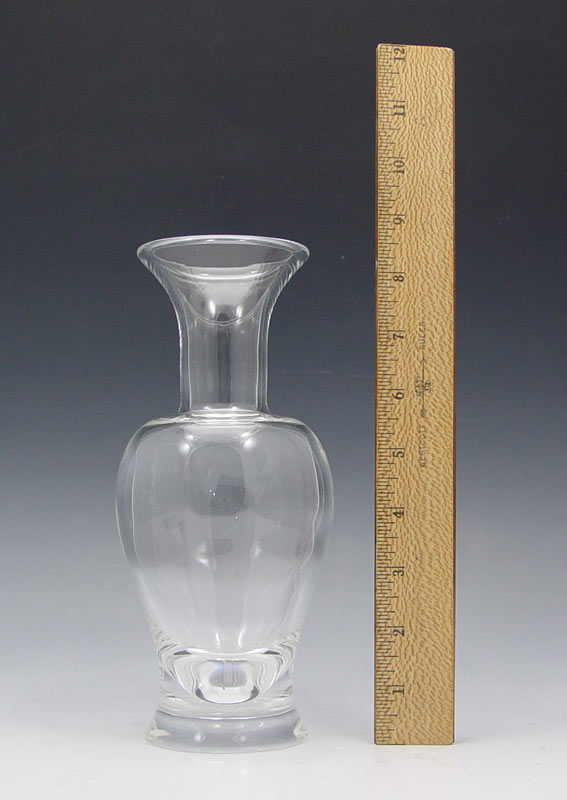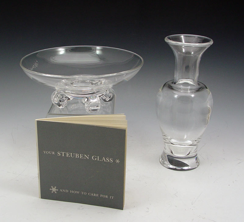 STEUBEN CLEAR GLASS VASE AND BOWL: To include 1) Scroll foot bowl etched Steuben signature. 3'' h. x 7 7/8''. 2) Baluster vase, signed, 8 1/2'' h. x 3 3/4''. Includes Steuben Glass how to care for pamphlet.