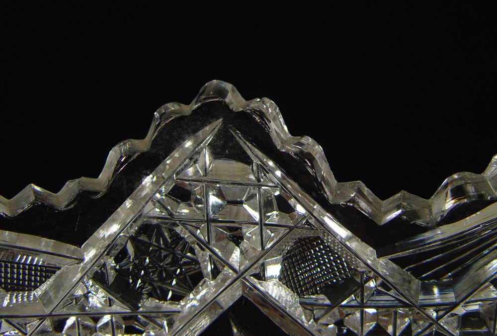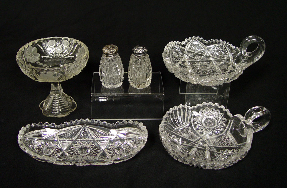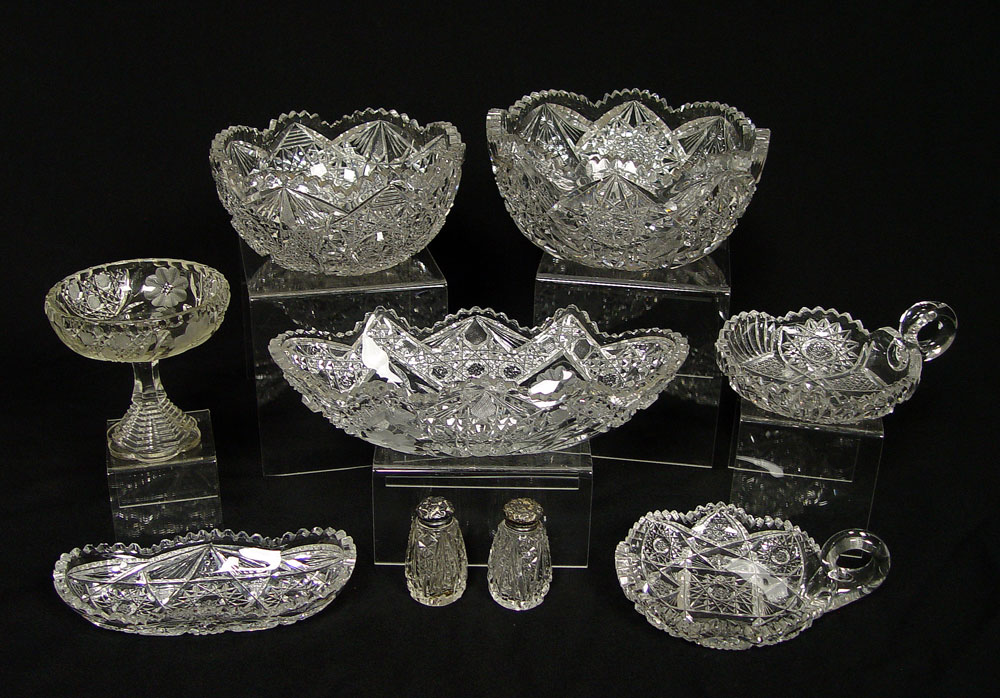9 PIECE BRILLIANT CUT GLASS) 1) Berry bowl, 9'' dia.. 4 1/2'' h. 2) An 8'' berry bowl. 3) Oblong bowl (11 1/2''l). 4) Relish dish (8''). 5) 6'' nappy. 6) 6'' nappy 7) 5'' compote. 8-9) Shakers with dented sterling lids.
