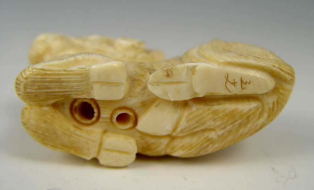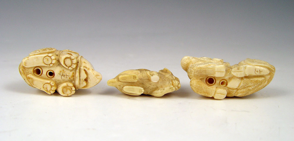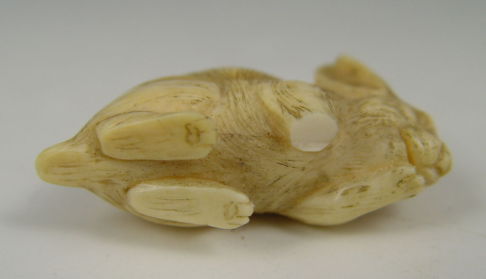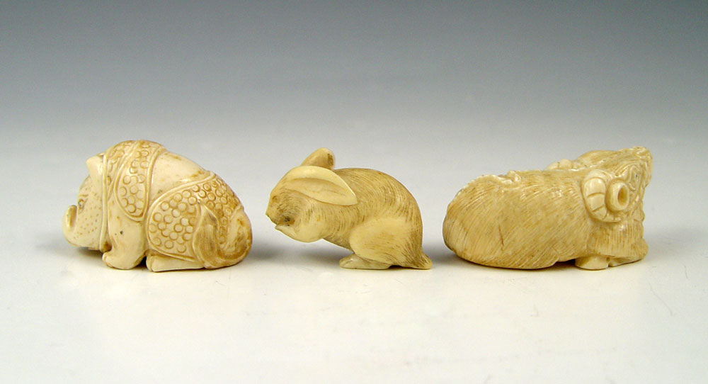 COLLECTION OF 3 CARVED IVORY ANIMAL NETSUKES: To include 1) Water Buffalo, signed in characters , 1'' h. 2) Rhino, signed in characters, 1 1/4''. 3) Rabbit, unsigned, 1''.