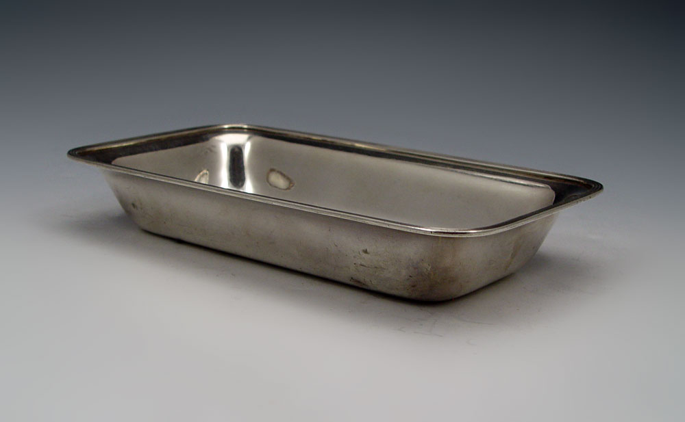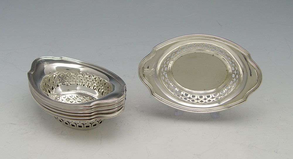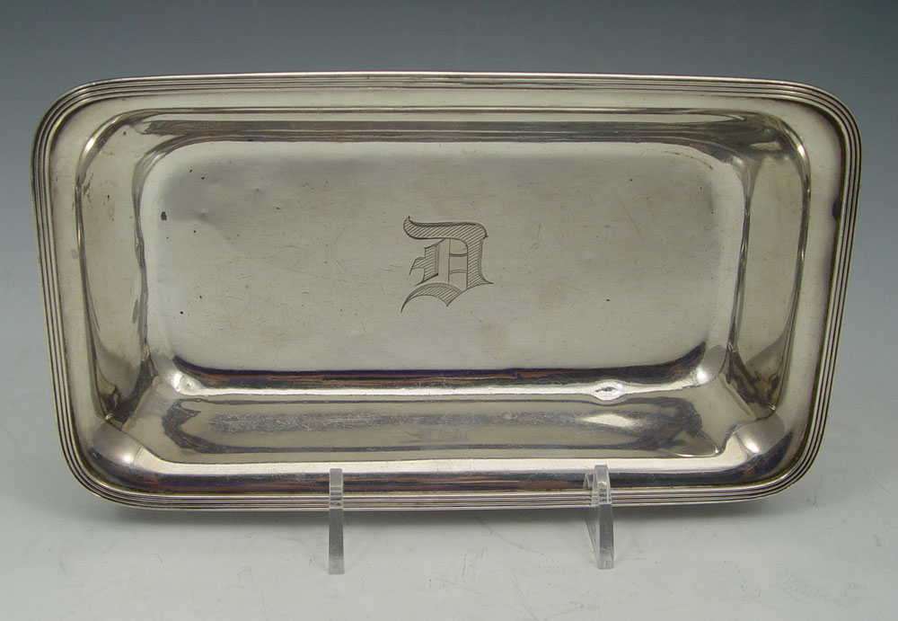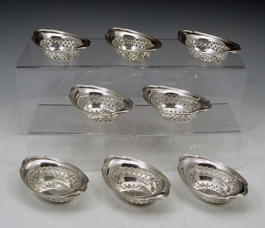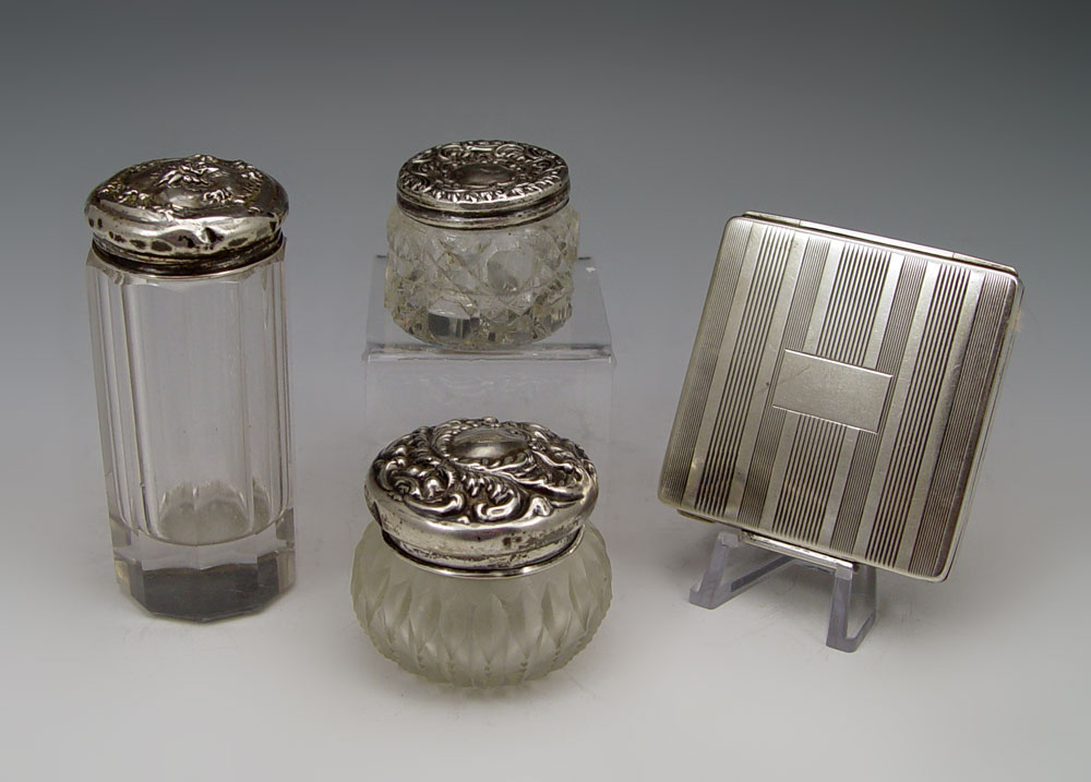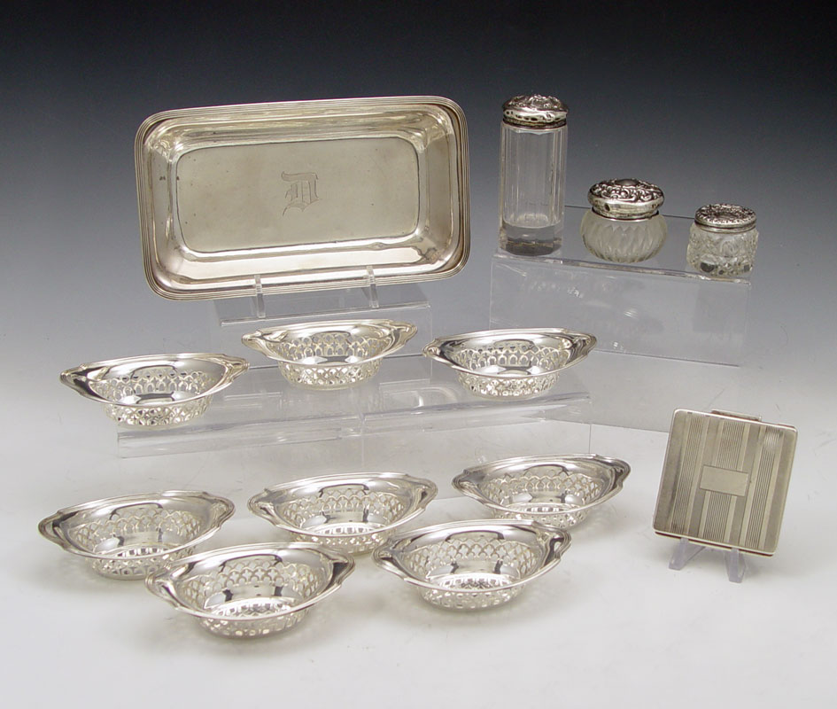 ESTATE COLLECTION OF STERLING AND ENGLISH SILVER: 13 pieces to include 1) 8 Gorham nut dishes 1'' h. 3 3/8'' x 2 3/4''. 2) International sterling tray, monogrammed,1 1/4'' h. x 7 1/2'' x 4 1/4''. 3) Sterling lid jar with embossed floral decoration, monogrammed. 3 3/4'' h. Note dings to silver. 4) Thomas Hayes, Birmingham 1901 embossed silver lid cut glass jar, 1 3/4''. Note dings to silver, sickness to glass. 5) Unknown maker 1904 London silver embossed silver lid cut glass jar. 1 1/4'' h. Note dings to silver. 6) Unknown maker sterling compact, 2 5/8'' x 2 1/2''. Approx. 11.8 troy oz.