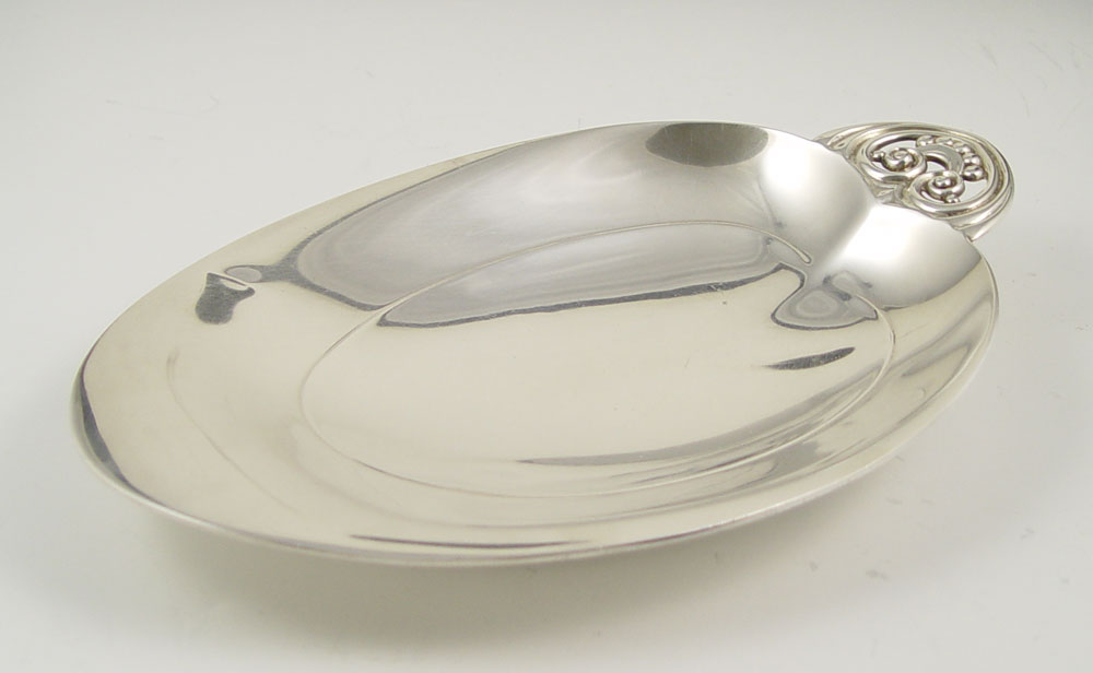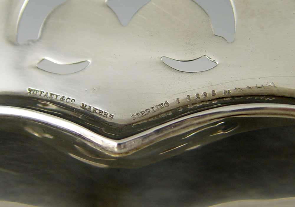 TIFFANY & CO. FOOTED STERLING TRAY: Oval deco design with 4 ball feet. Marked Tiffany & Co. Makers Sterling 22898. Measures 1 5/8'' h. x 10 1/2''. Approx 10.3 troy oz.
