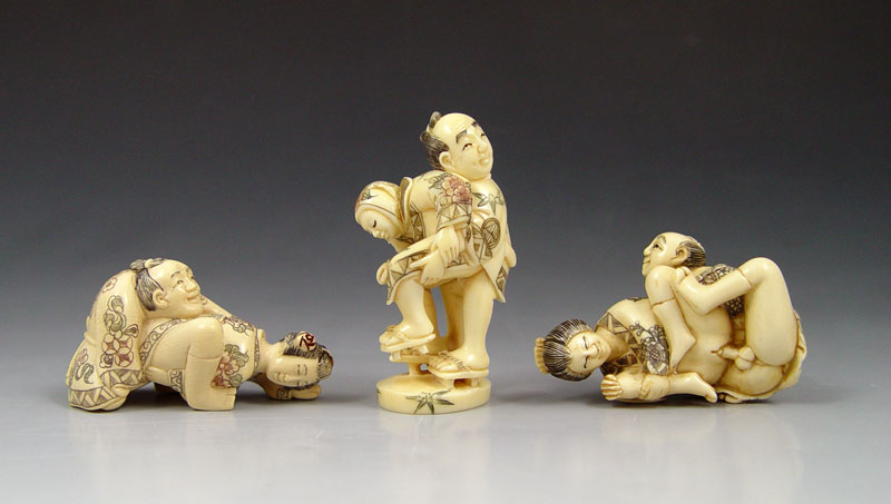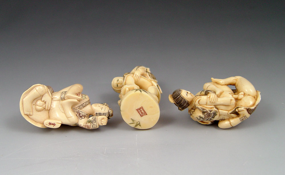 COLLECTION OF 3 IVORY EROTIC OKIMONO: To include 1) Man and woman copulating, signed in characters, 1 1/8'' h. x 2''. 2) Man and woman copulating standing up, signed in characters, 2 1/8'' x 1 1/4'' dia. 3) Man and woman copulating, signed in characters, 1 1/4'' h. x 2''.