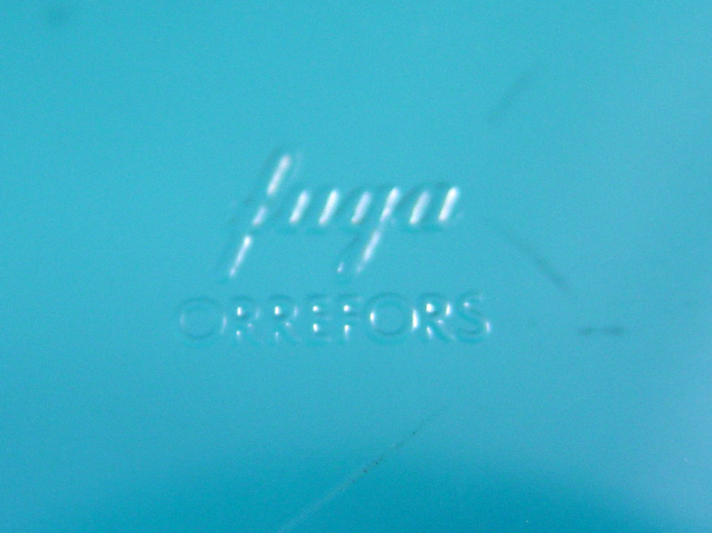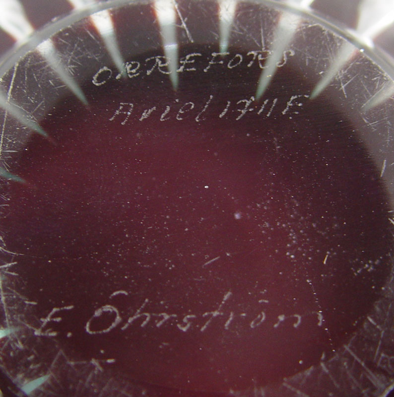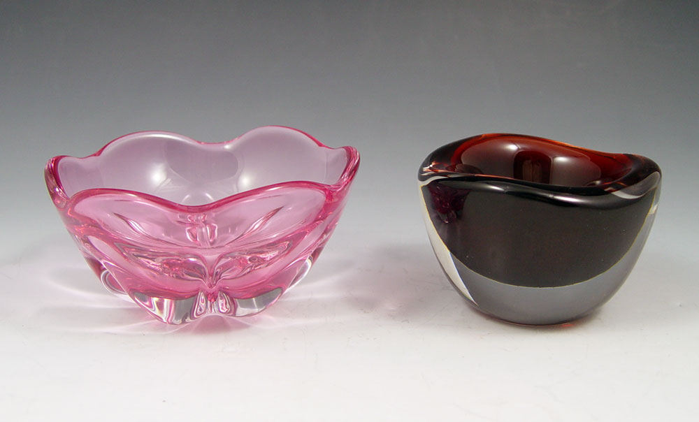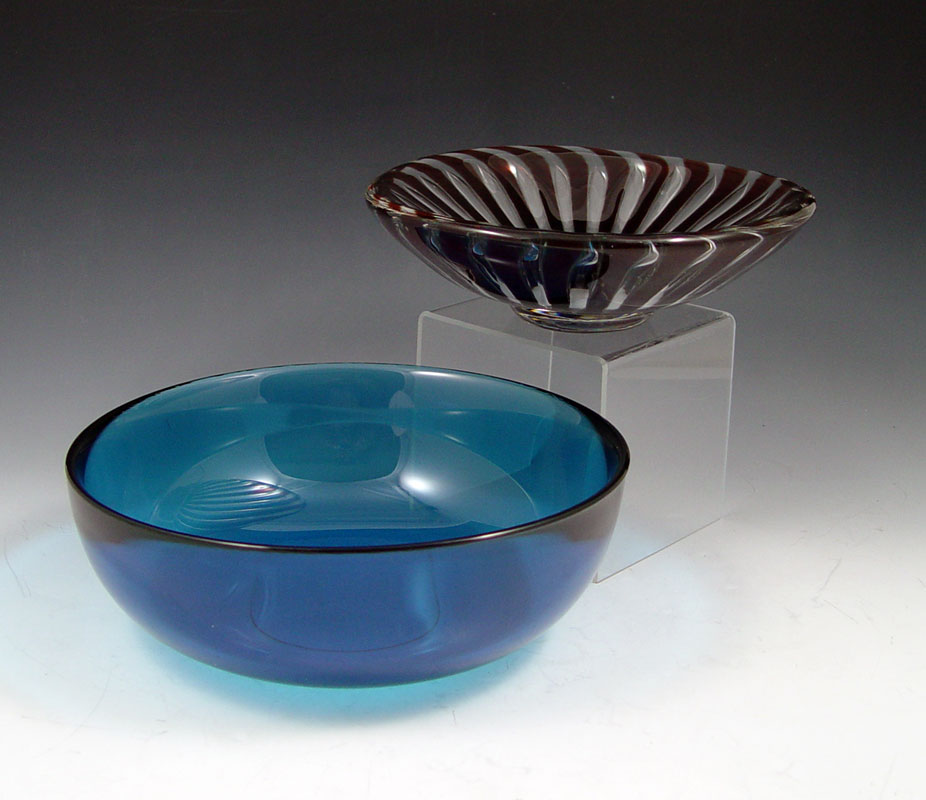 5 ORREFORS BOWLS: To include, Pink Afors 1989? Rubin fluted bowl, 4 1/2'' x 2''h.; Free form clear glass, numbered N3516-211, approx. 13 1/2''dia. x 3 1/2''h.; ''Arielithe?'', ribbed red and clear bowl, signed E Ohrstrom, 8''dia. x 2 1/4''h.; ''Fuga'' bowl in blue, 8 3/4'' x 3''; Ruby to clear tiny bowl, numbered PU 3092/1, 3 1/2'' x 2 1/4''. Sold as a lot.