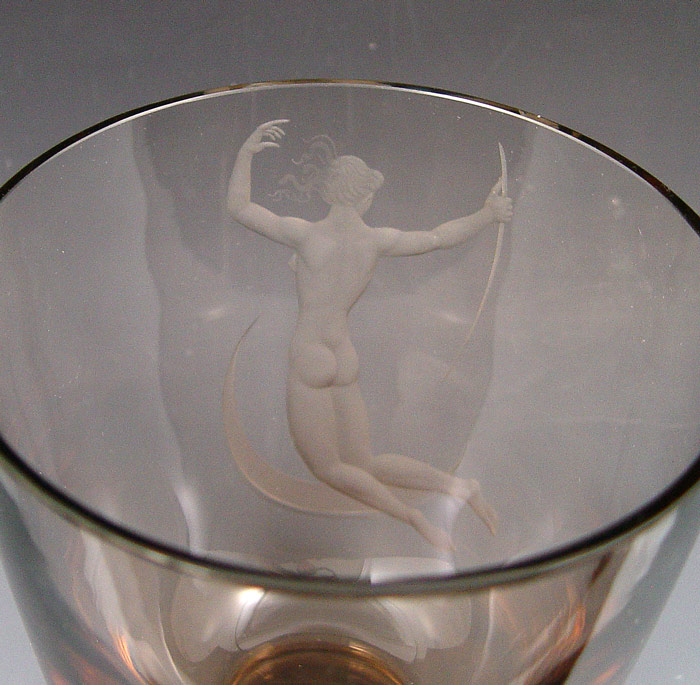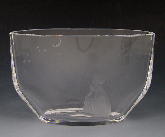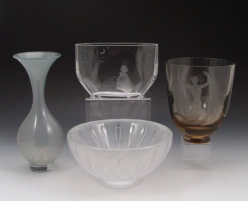 4 ORREFORS CRYSTAL ITEMS: To include 1)N. Landberg flared bottle neck vase in blue grey fade to clear, signed and marked Sweden Expo 1187, 8 5/8''h. x approx. 3 1/2''dia.; 2)E. Ohrstrom ''Ariel'' bowl, signed and marked Sweden 523 E, heavy, 3 1/2''h. x 7 3/16''dia.; 3)Flat vase depicting young girl with moon & stars, marked A.F2769.111.E1.9.5, 4 1/4'' h. x 6 1/2'' x 2 3/8''; and 4)Lindstrand smoky vase etched with a rear view of a naked goddess Diana?, signed and marked 14473A1.1L, 5 7/8''h. x 5''dia. Sold as a lot.