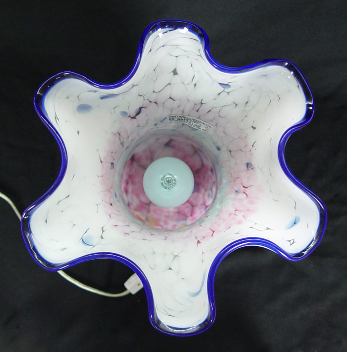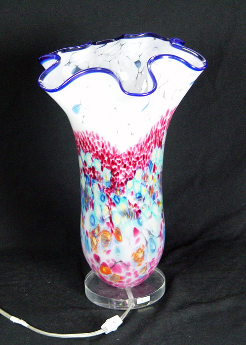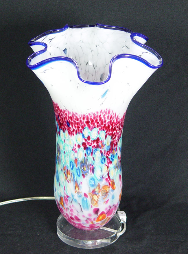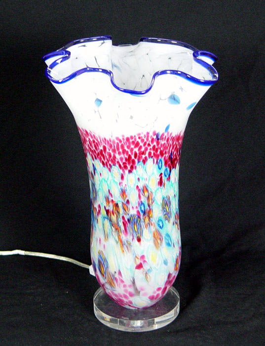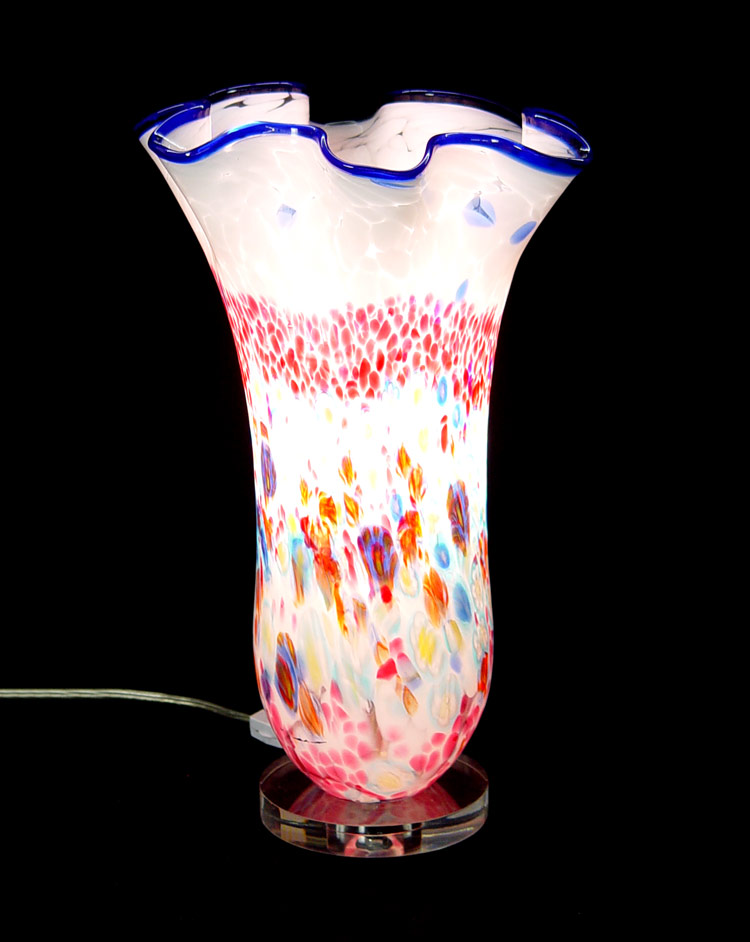 MILLEFIORE HAND BLOWN MURANO GLASS TABLE LAMP ON LUCITE BASE: Made in Murano, Italy. Switch on cord. 18'' h. x 12''.