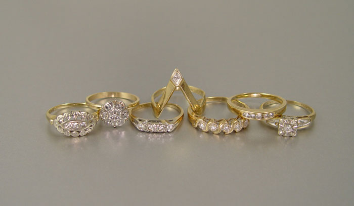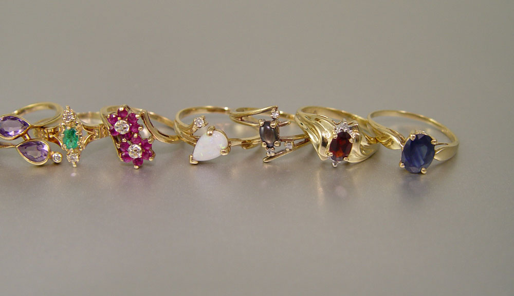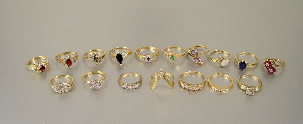 LOT OF 17 GOLD RINGS: Ten 14K yellow gold rings. Weight: 22.1 grams. Seven 10K yellow gold rings; Weight: 13.8 grams. Diamond weight: .75 Ct. approx. Assorted gemstones.
