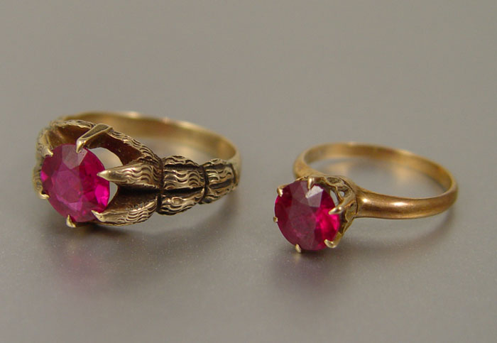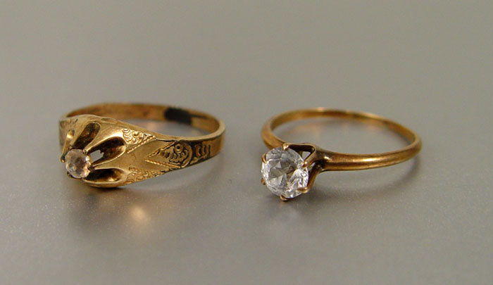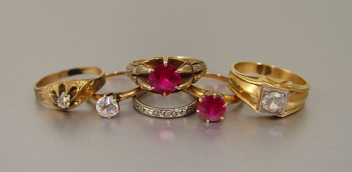 LOT OF 6 GOLD RINGS: Five 14K rings and one 18K ring. Synthetic and simulated stones. Weight: 14K 16.7 grams Weight: 18K 3.0 grams.