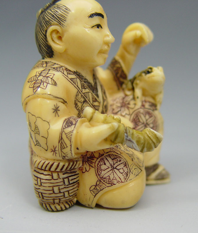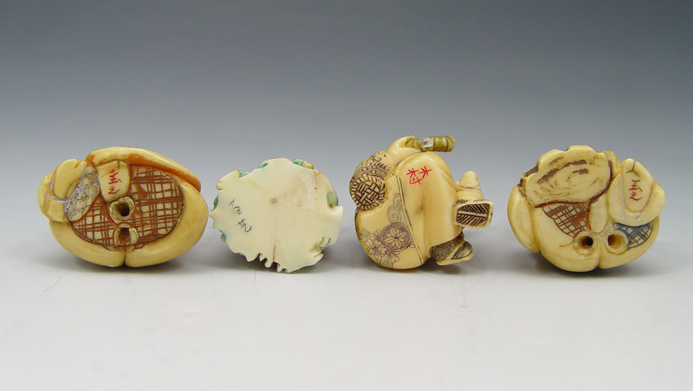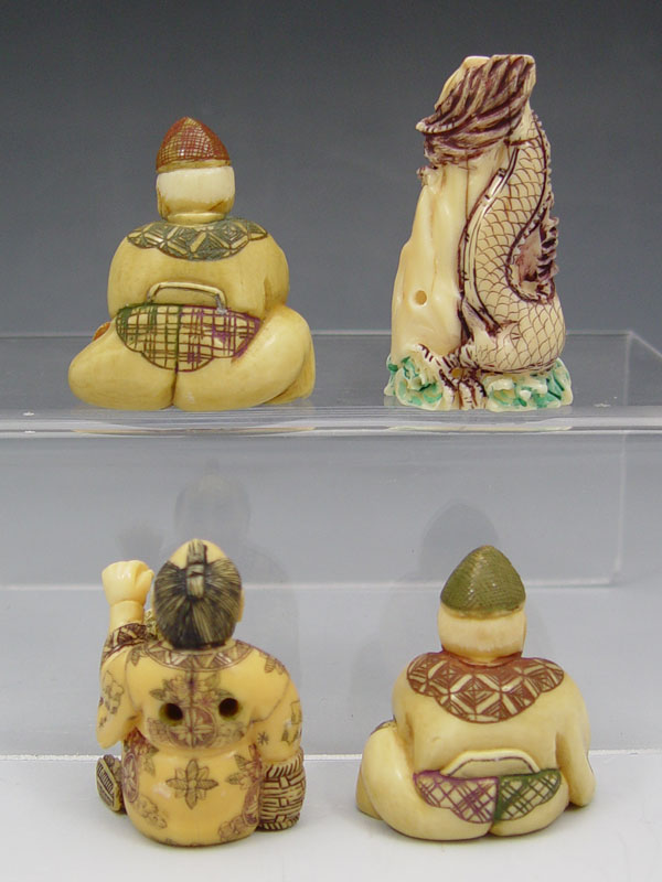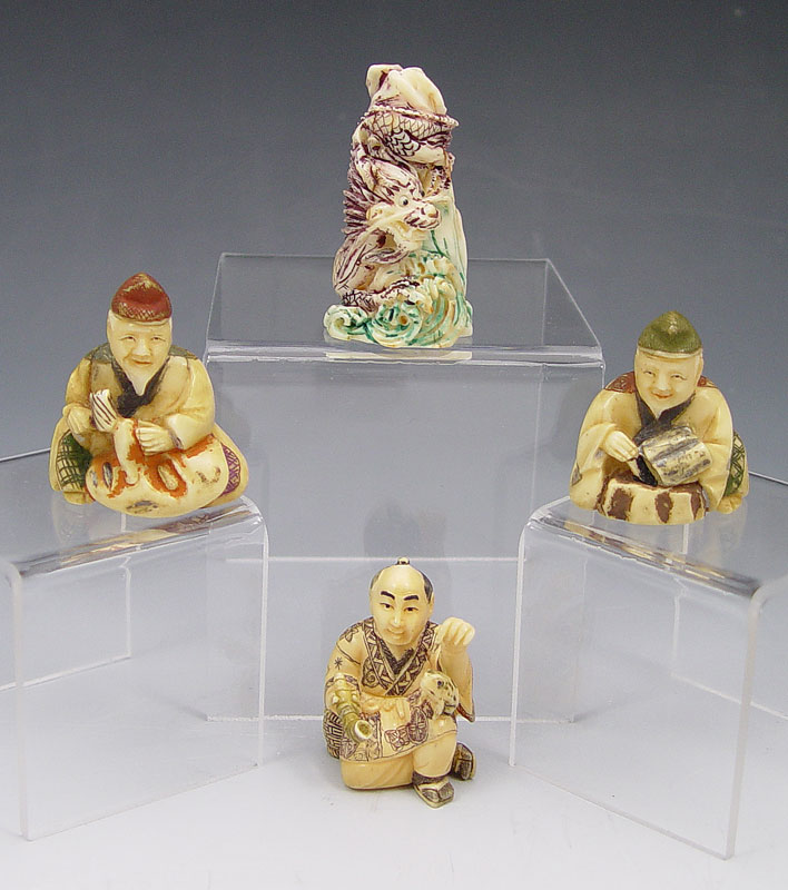 COLLECTION OF 4 IVORY NETSUKES: To include 1) Man with pipe and frog, signed in characters, 1 3/4''. 2) Seated man with book, signed in characters, 1 1/2''. 3) Man seated with mallet, signed in characters, 1 3/4''. 4) Figural dragon, signed in characters, 2''.