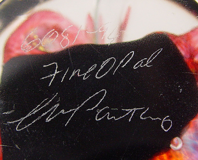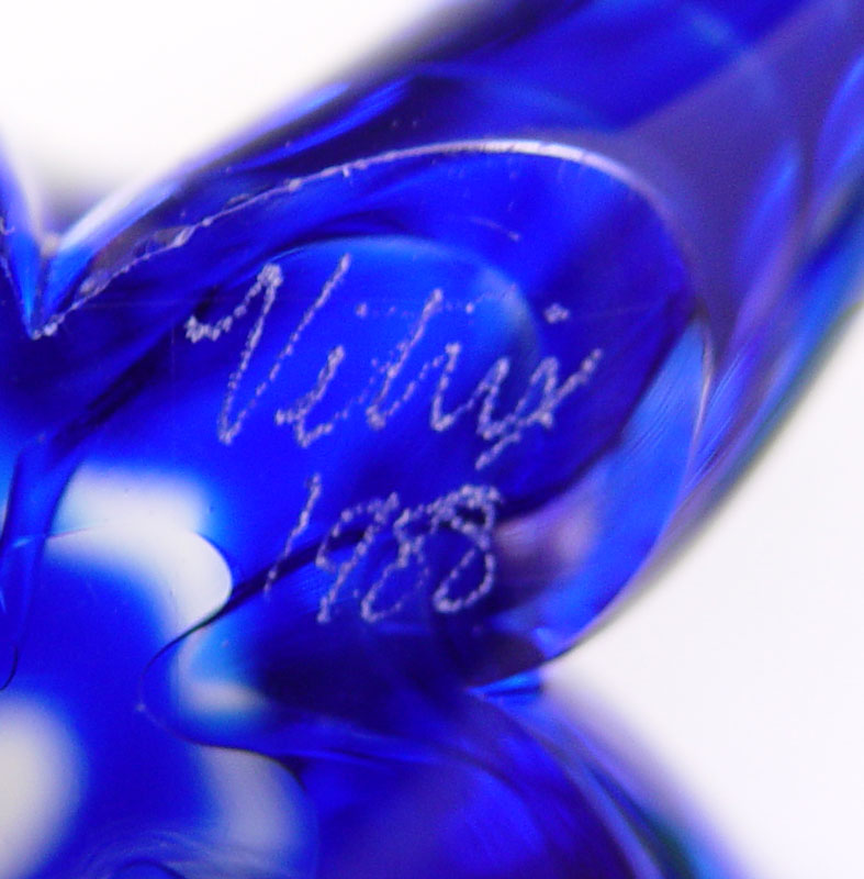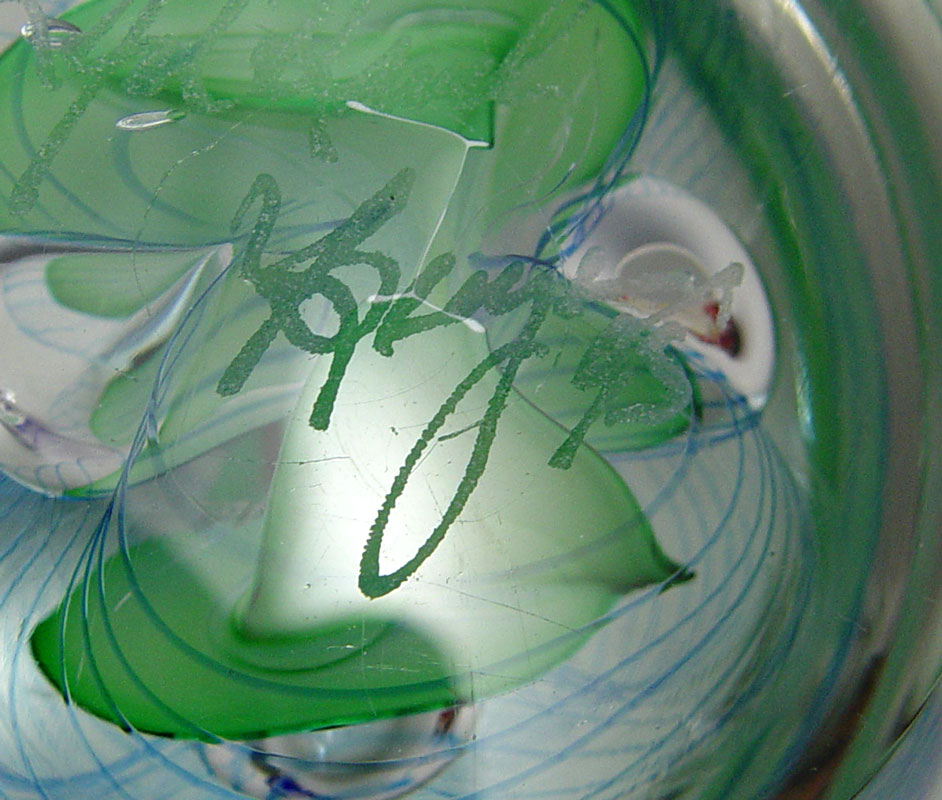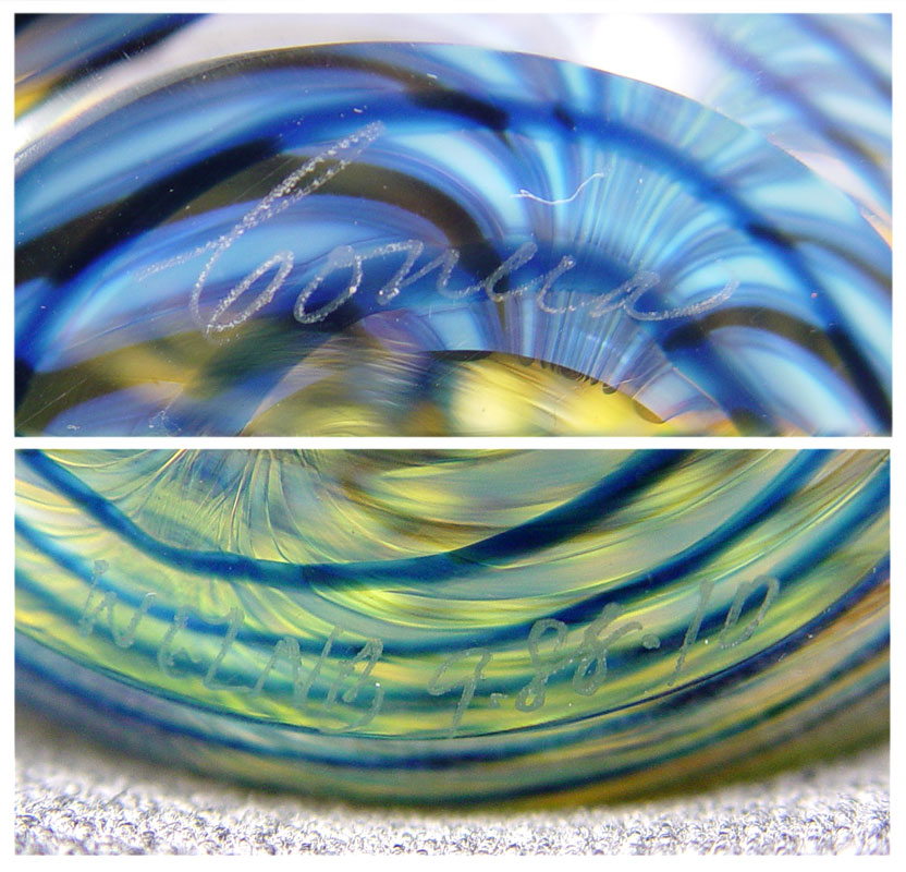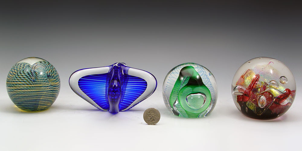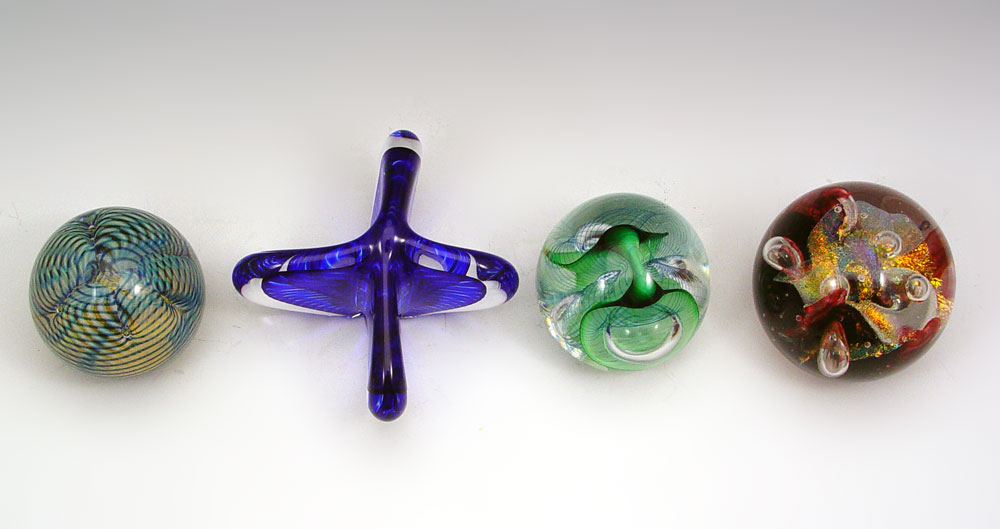ESTATE LOT OF ART GLASS PAPERWEIGHTS: To include, 1)CORREIA, bubbles and blue lattice work, signed WELNB 9.88.10, approx. 3''(525); 2)PANTANO ''Fine Opal'', signed, numbered 6081, dated 94, approx. 4''dia. x 3 1/2''h.(527); HAL DAVID BERGER, round bubbles, green ribbon and blue swirls, signed & dated 95, approx. 3 1/4''h.(529); VITRIX Hot Glass, freeform ''X'', cobalt and clear, signed & dated 1988, 5 1/2'' x 6'' x 2 3/4''h.(530). Sold as a lot.