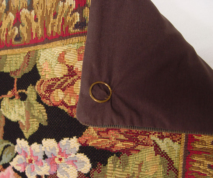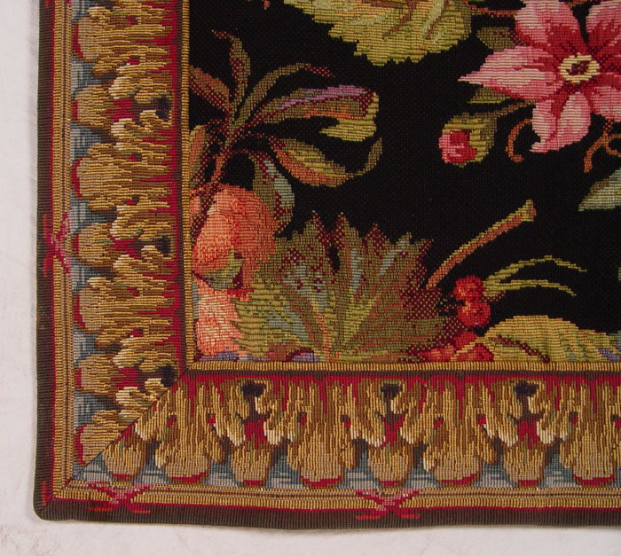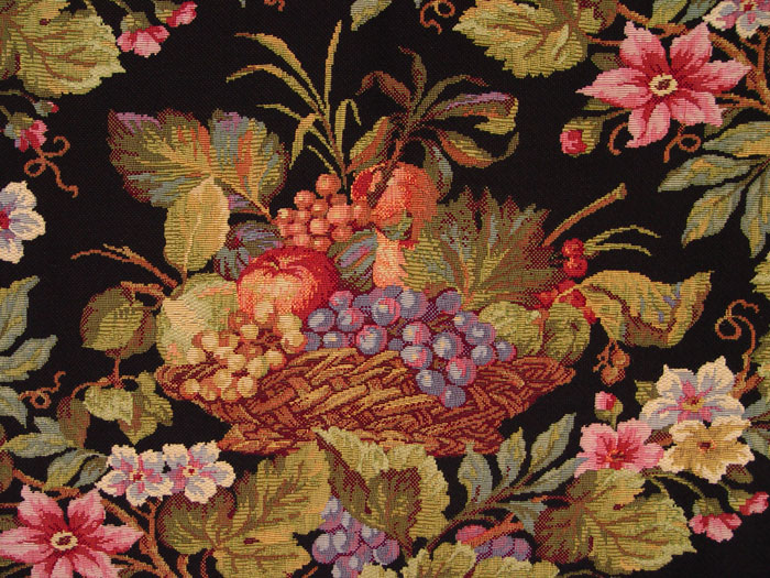 RICHLY COLORED FRUIT STILL LIFE TAPESTRY: Bowl of fruit framed in grape vines and flowers. Approx. 50'' x 62''.