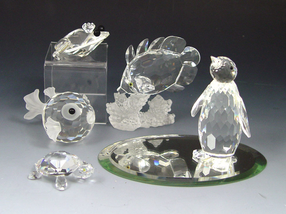 FIVE SWAROVSKI FIGURES: To include, Large Blow Fish, approx. 1 3/4'' x 2'', Swan mark; Butterfly Fish, retired 1998, Michael Stamey designer, Swan mark, tiny chip in top fin #3, approx. 3''; Turtle, Swan mark, green eyes, 1 7/8'' x 7/16''h.; Frog Prince, retired 1991, Max Schreck designer, Swan mark, 1'' x 1 7/8''; Large Penguin, retired 1995, approx. 3 1/8''h. Sold as a lot.