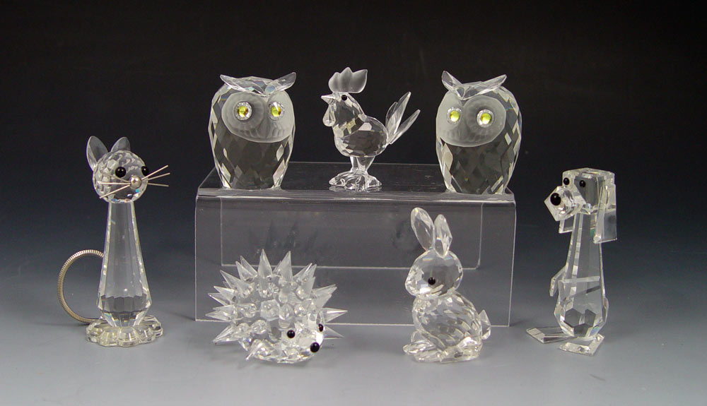 SEVEN SWAROVSKI FIGURES: To include, two OWLS, 1 3/4''h., Max Schreck designer, retired 1995, Swan mark, one box; PORCUPINE, retired, Swan mark, with box, approx. 1 1/4''h. x 2 1/4''; Mother RABBIT, Adi Stocker designer, retired 2004, approx. 2''h.; ROOSTER, retired 2000, 1 7/8''h.; Standing Dog, ''PLUTO'', Swan mark, approx. 2 5/8''; and CAT with metal tail, Max Schreck designer, Swan mark, 2 7/8''. Sold as a lot.