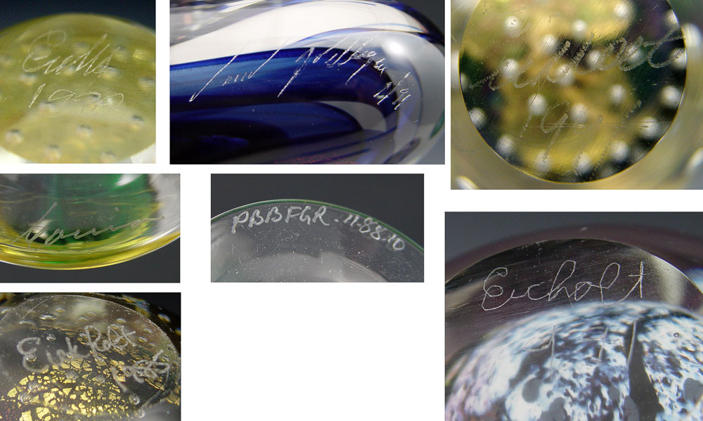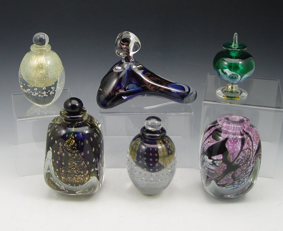 ESTATE LOT OF 6 ART GLASS PERFUMES: 2 large EICKHOLT, signed and dated, one 1985 the other 1991, approx. 3''square base slightly tapered to top, approx. 6''h.; 2 small EICKHOLT, signed and dated, one 1991, the other 1992, approx. 3''dia, 5''h.; 1 DAVID GOLDHAGEN freeform with gem tone interior, approx. 6 1/2'' x 3 1/2'' x 5''h.; 1 CORREIA, green with peacock feather design, signed, marked PBBFGR, dated 11.88.10, complete but ill fitting dauber, 3 3/8''h. plus dauber. Sold as a lot.