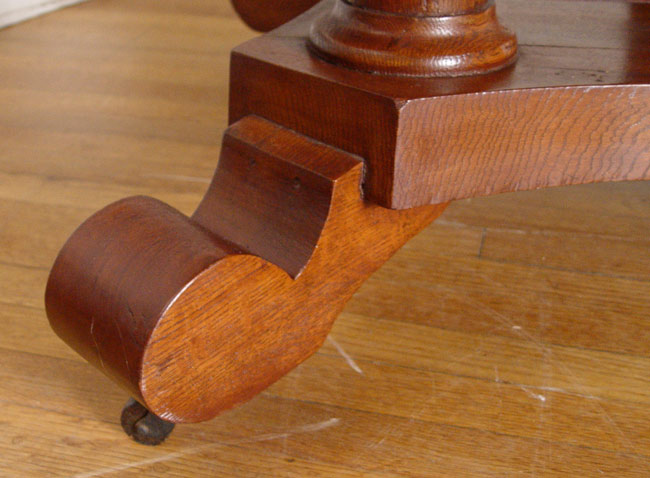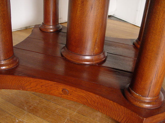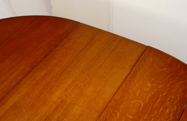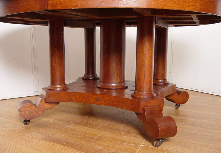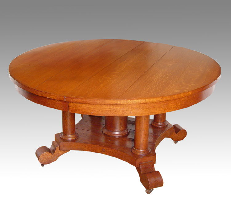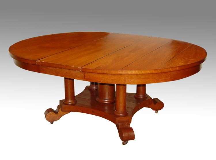 A GRAND LATE 19th C OAK EXPANDABLE DINNING TABLE: Round top on a 5 column base. 30'' tall x 59'' dia., expands to 96'' oval with the 2 leaved in place.