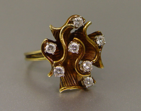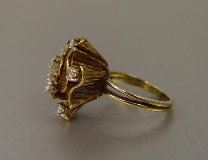 SEVEN STONE .5 CT DIAMOND RING: 14K yellow gold ring contains seven round brilliant cut diamonds. Weight approx. .50 Ct. Approx. The diamonds average VS in clarity and I-J in color. The diamonds are prong set. Weight: 9.5 grams. Size: 7