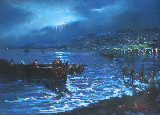 CARIGNANI, Roberto, (Italian, 1894-1988): Bay of Naples Nocturne, Pastel, 19 1/2'' x 27 1/2'', signed, framed, 22'' x 30''.