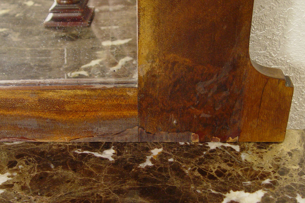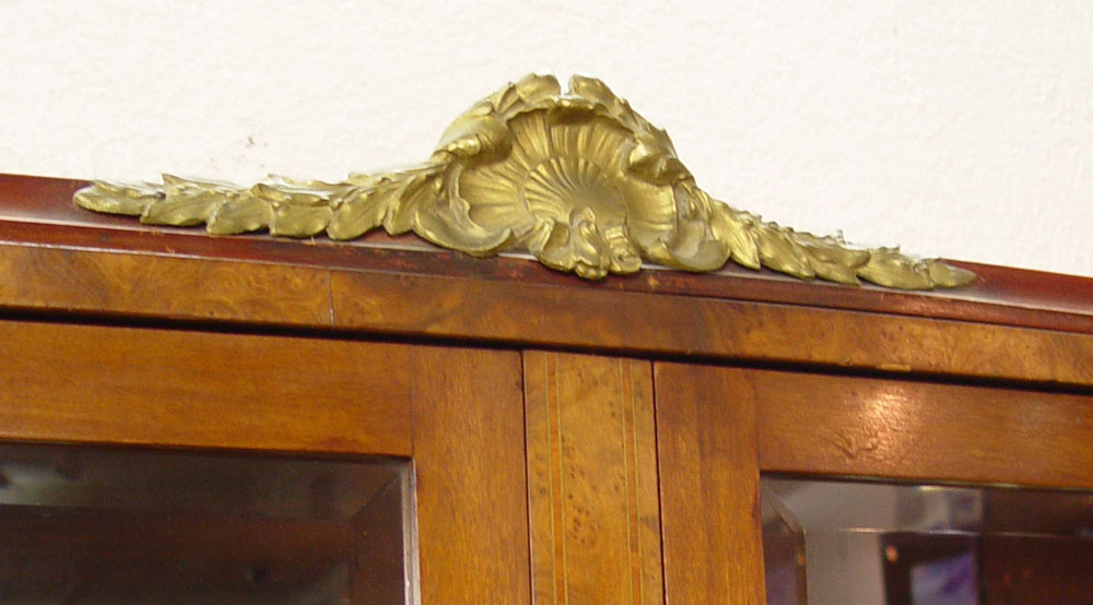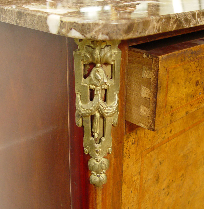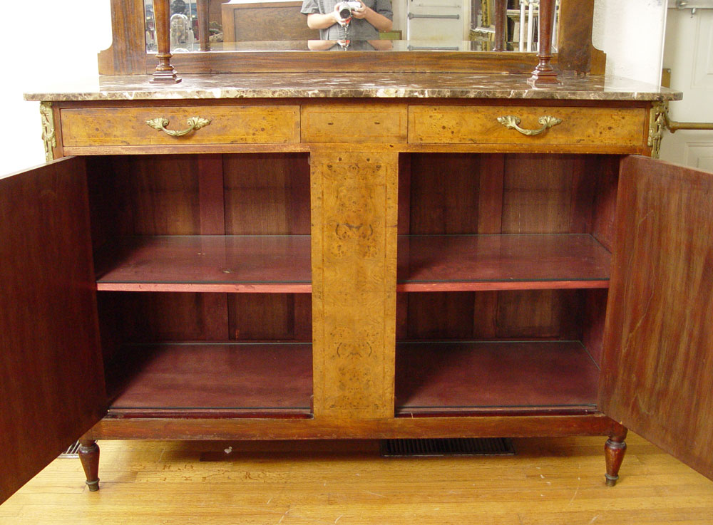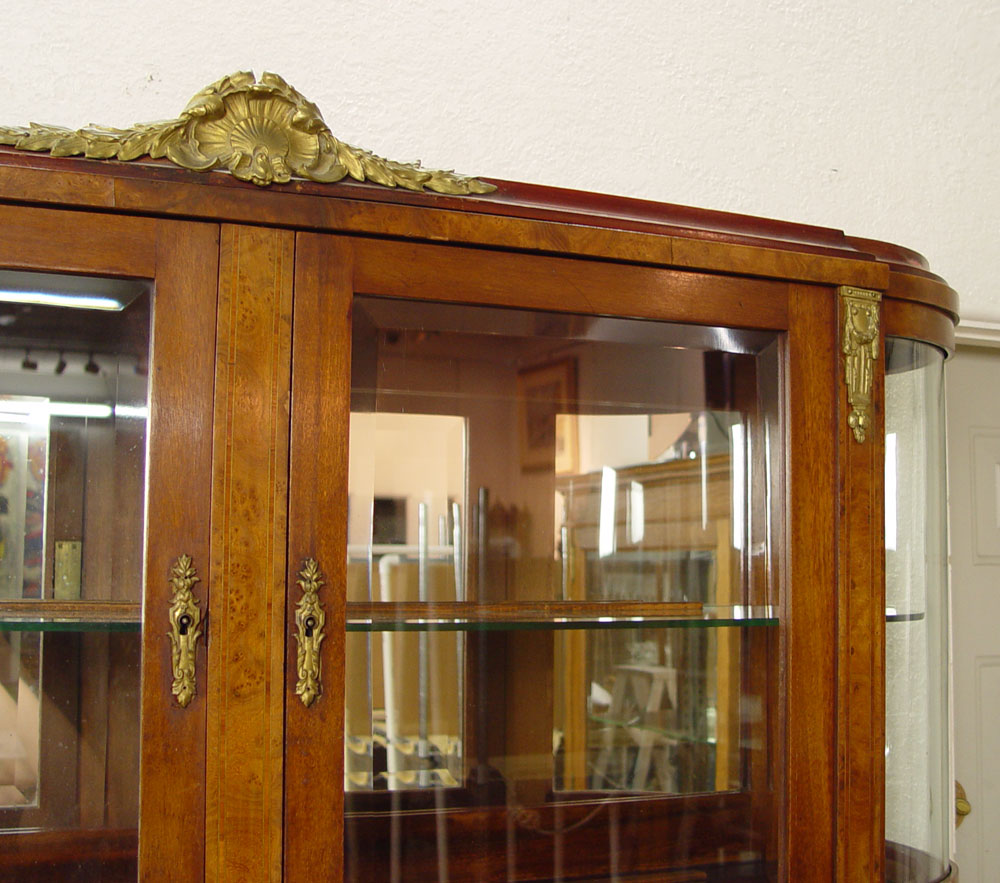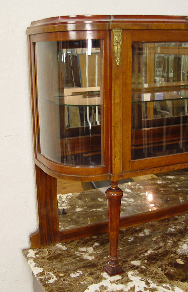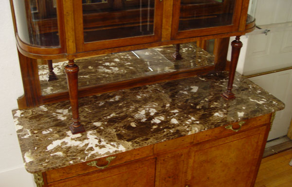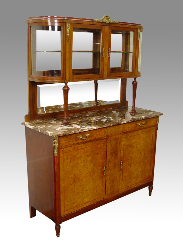TWO PART FRENCH SIDEBOARD CABINET: Marble top, 2 door 2 drawer base under curved glass display cabinet. Burled veneers, string inlay, mirror back, and ormolu mounts. Approx. 80' tall x 59'' x 22''.