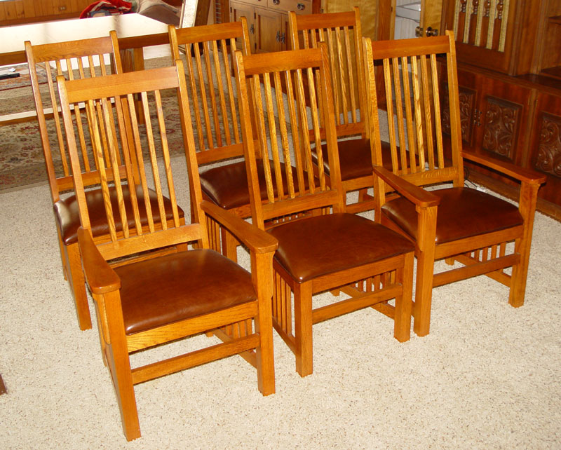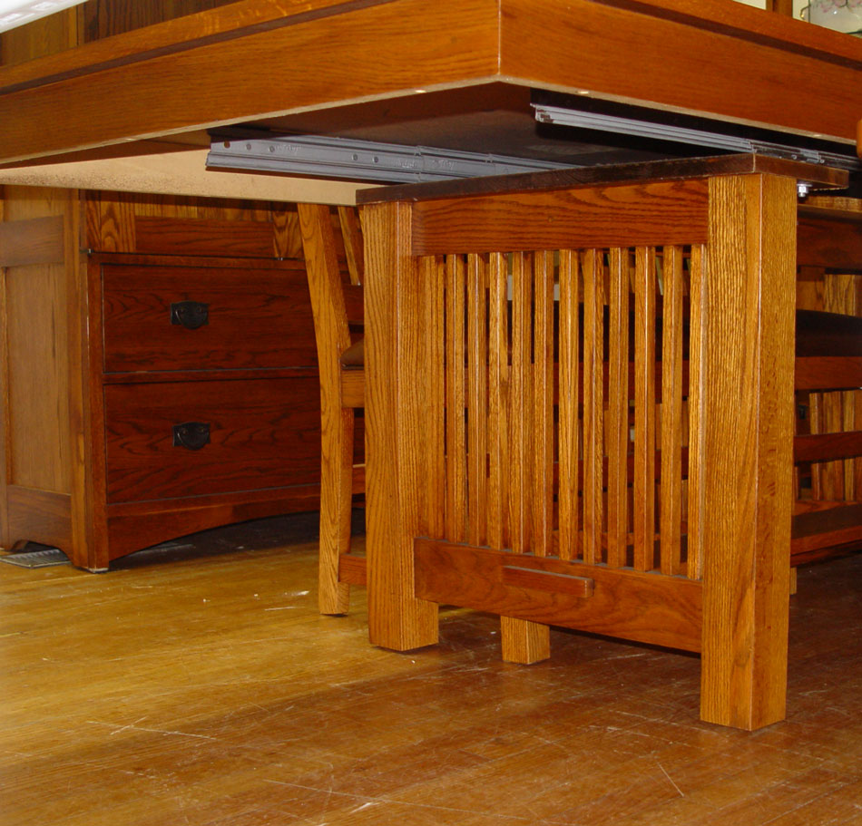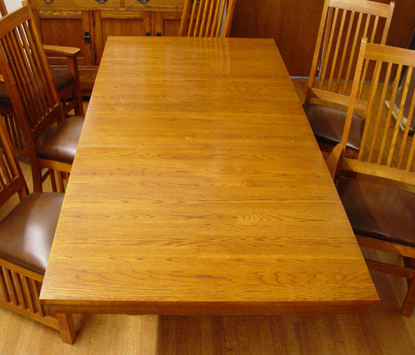 THOMASVILLE IMPRESSIONS ARTS & CRAFTS STYLE DINING TABLE WITH 6 CHAIRS: Table with 2 leaves, 6 chairs. Table measures 30 1/4'' h. x 44 1/2'' x 74 1/2'', leaves 20'' wide. 2 arm, 4 side chairs, 46 1/2'' h. x 26'' x 26''. Sold with padded table cover.