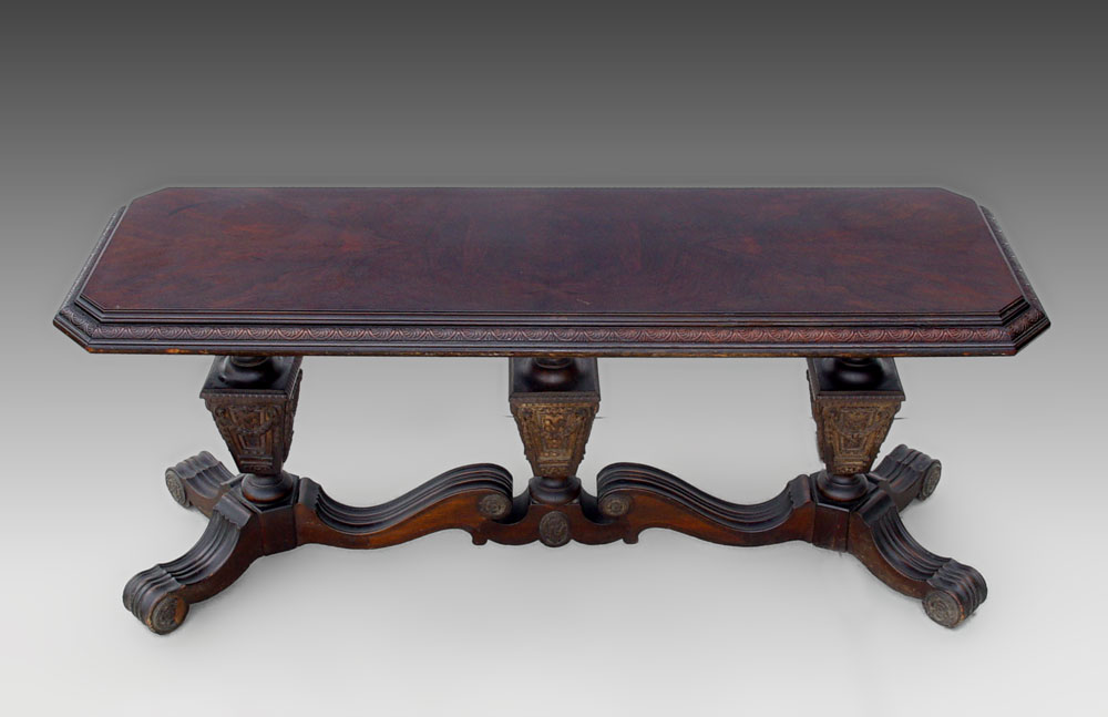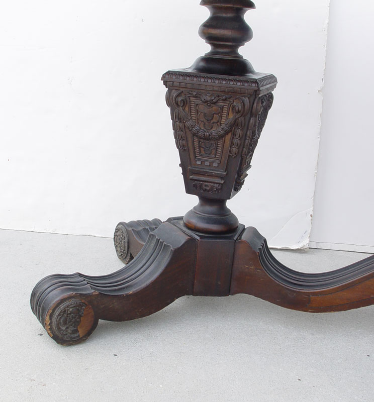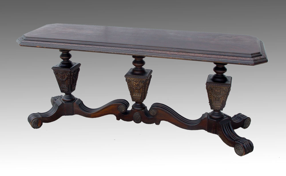 ORNATELY CARVED SOFA OR FOYER TABLE: Ca. 1920's mahogany veneer table with applied carvings (some loss). Triple pedestal base, paw feet. 28''h. x 66'' x 28''.