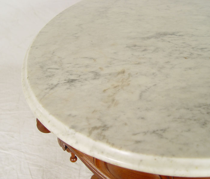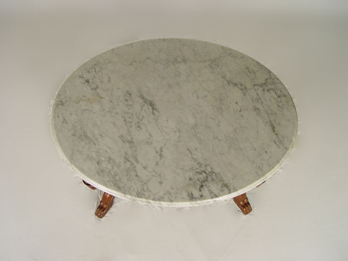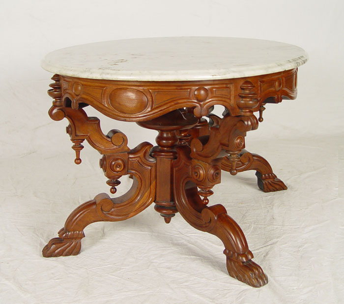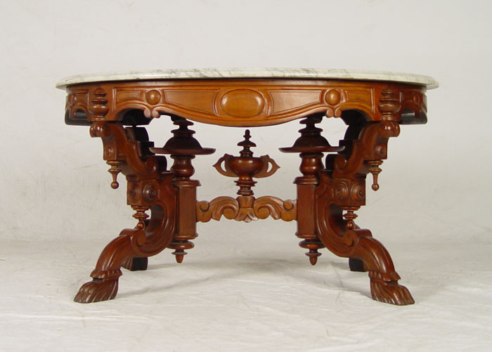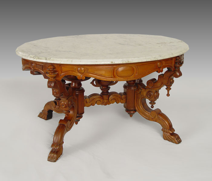 ROCOCO VICTORIAN MARBLE TOP TABLE: Cut to coffee table height. Oval marble top, walnut base with elaborate carvings and turnings. Double pedestal base joined by stretcher, paw feet. 20'' h. x 37'' x 27 1/2''.