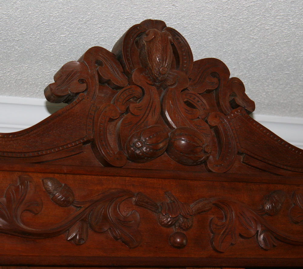 19TH C VICTORIAN WALNUT SECRETARY DESK: Upper section is a 3 glass door bookcase with lock and key. Kneehole base desk bottom. with drawers and side cabinet. Carved and applied decoration. Approx. 95'' tall x 55'' x 24''.
