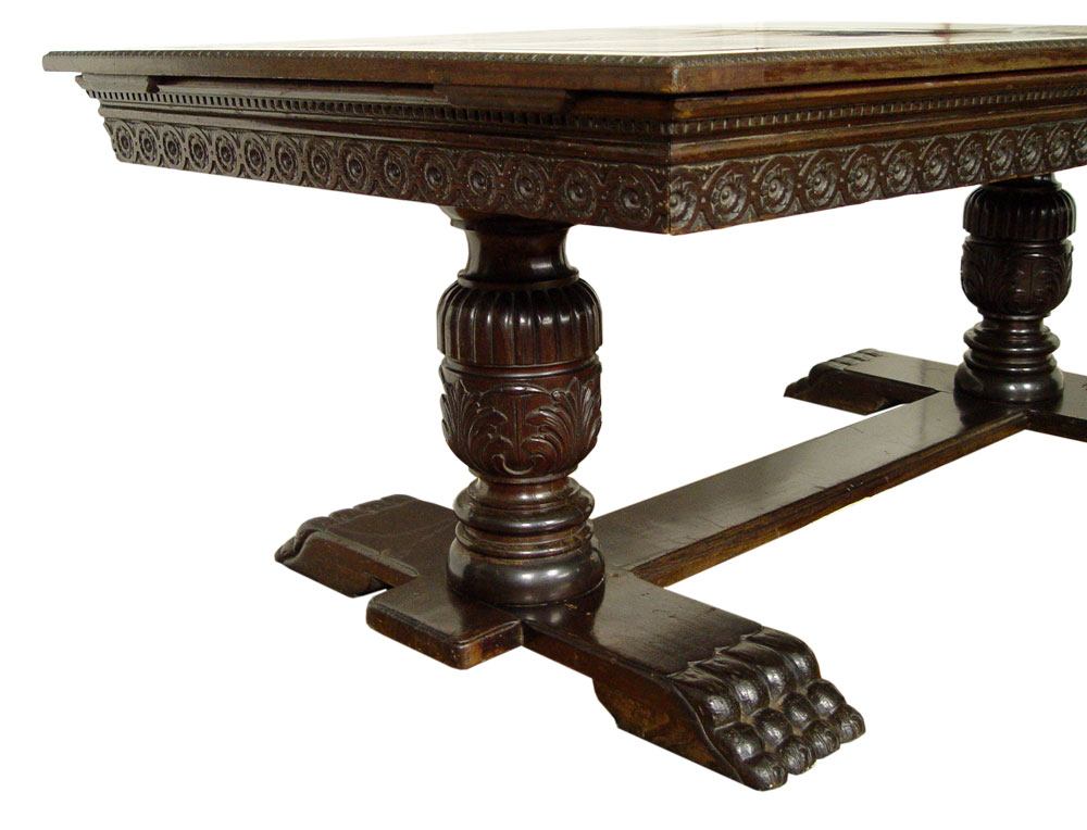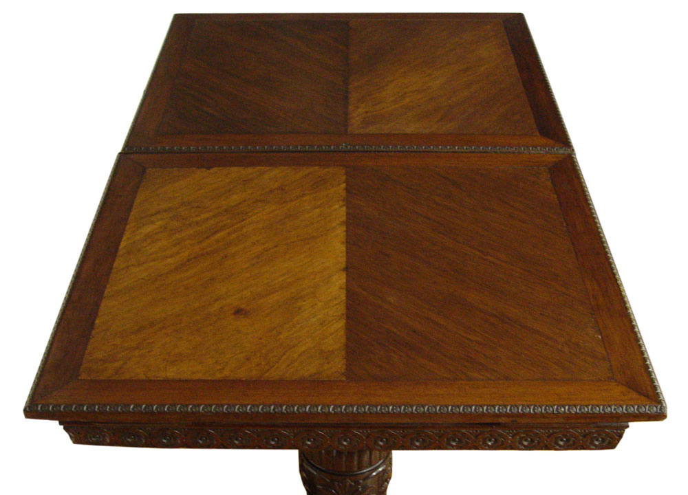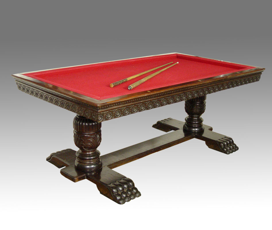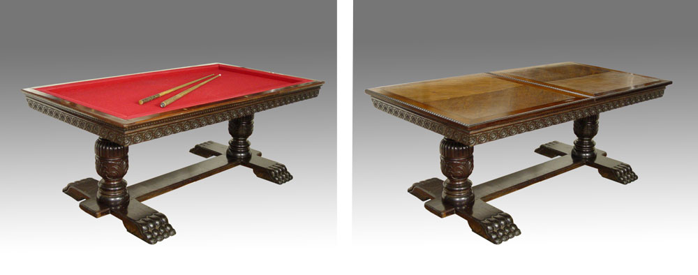LATE VICTORIAN ERA SNOOKER TABLE CONVERTS TO DINING TABLE: On heavily carved mahogany double pedestals joined by a stretcher, heavy paw feet. Outer panels lift off to expose the felt covered slate top, 42'' x 75''.