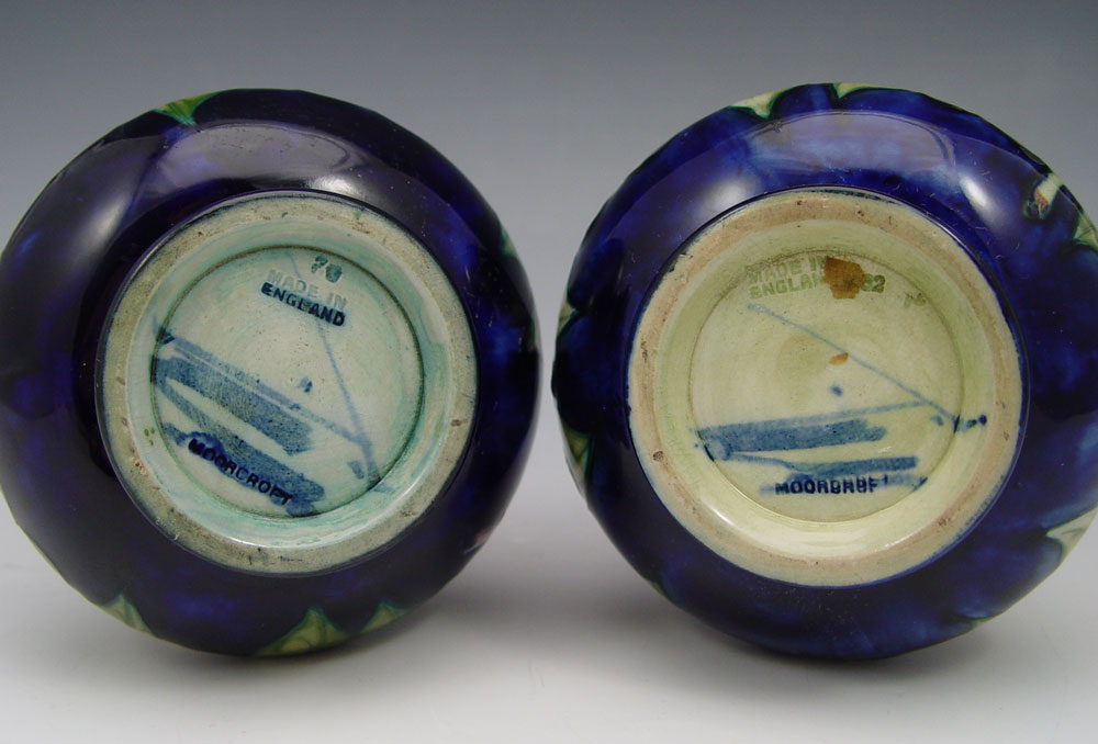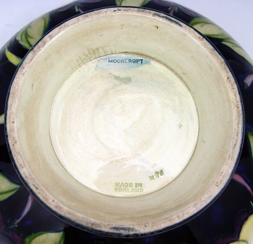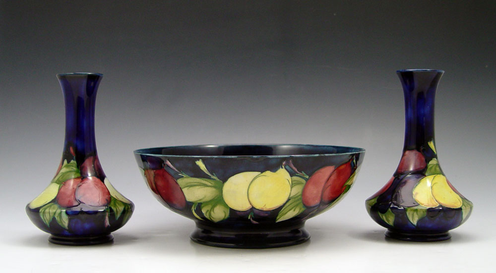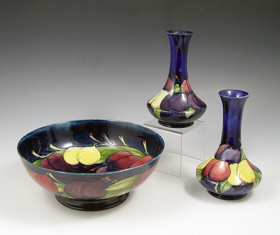 MOORCROFT WISTERIA VASES AND BOWL: Bright coloration on cobalt ground. The bowl, 8 1/4'' dia., 3'' deep. The pair of vases, 6'' tall.