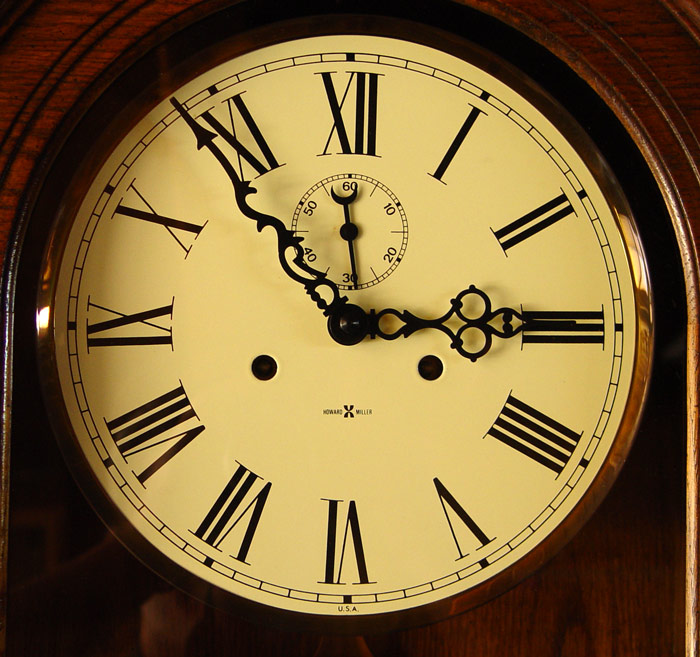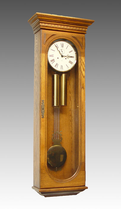 HOWARD MILLER WALL REGULATOR CLOCK: Oak case with double weight and pendulum movement. Measures 52'' x 18 1/2'' x 8 1/4''.