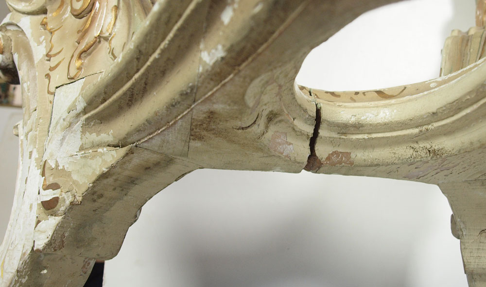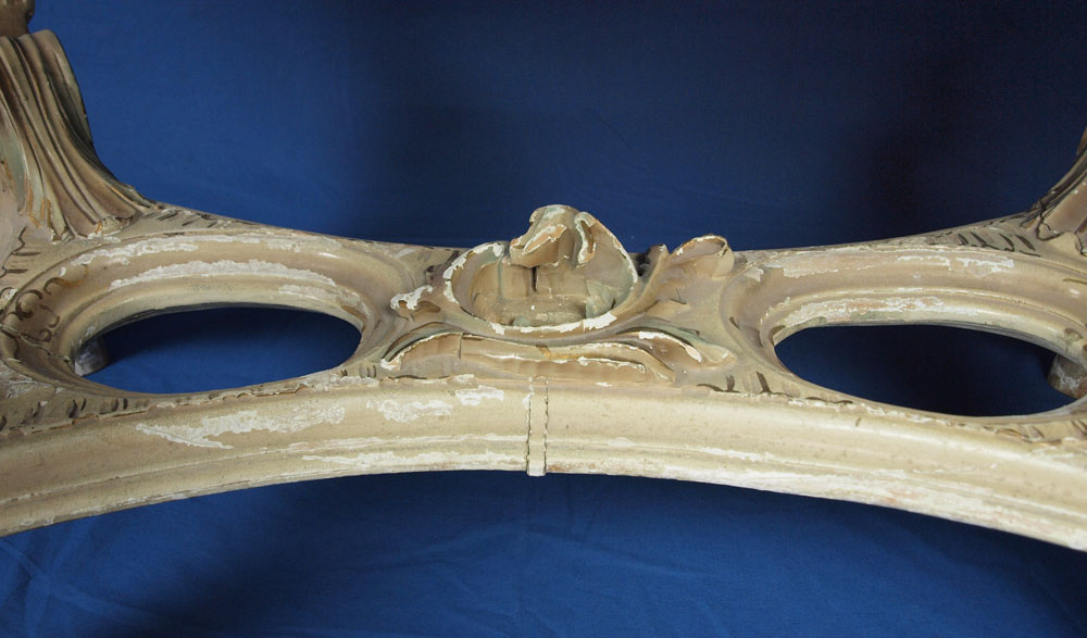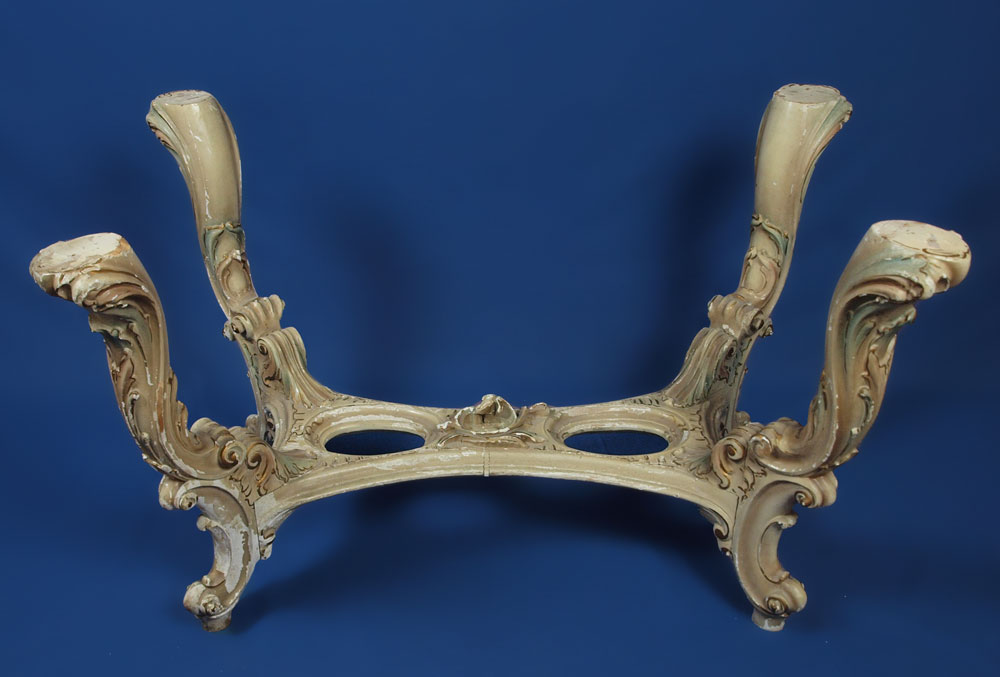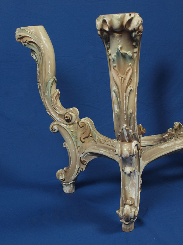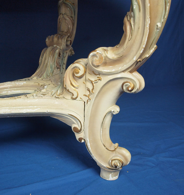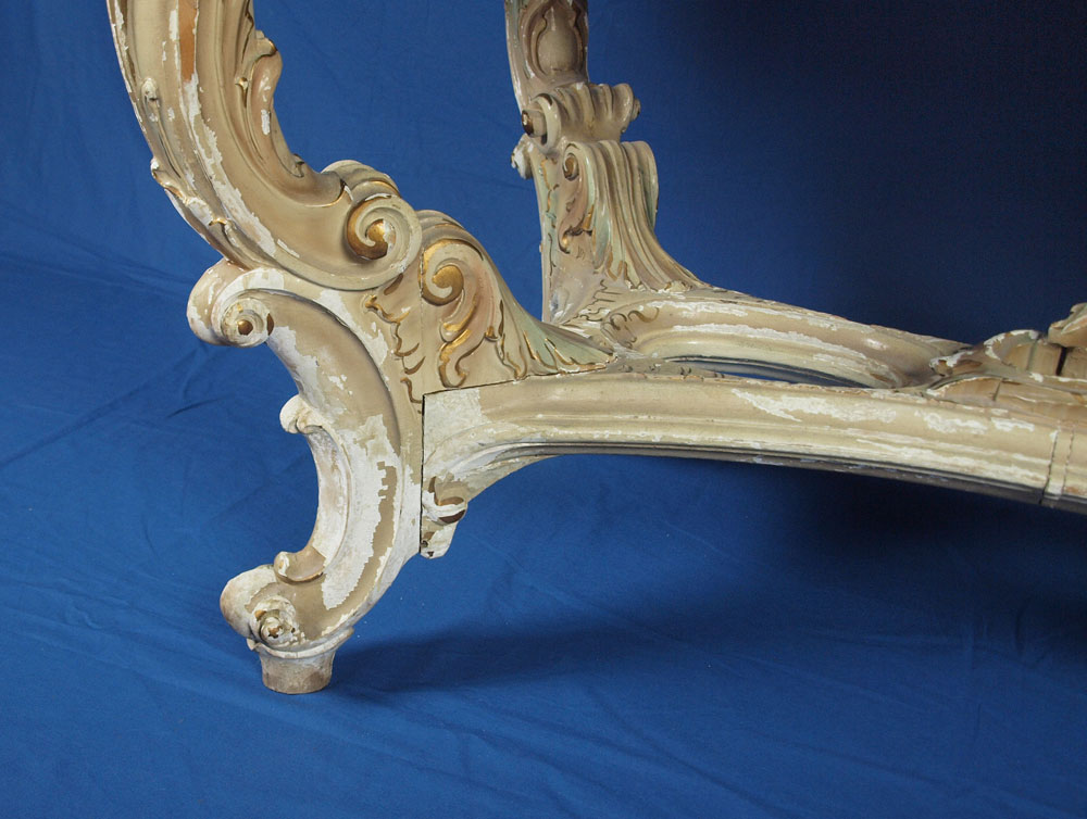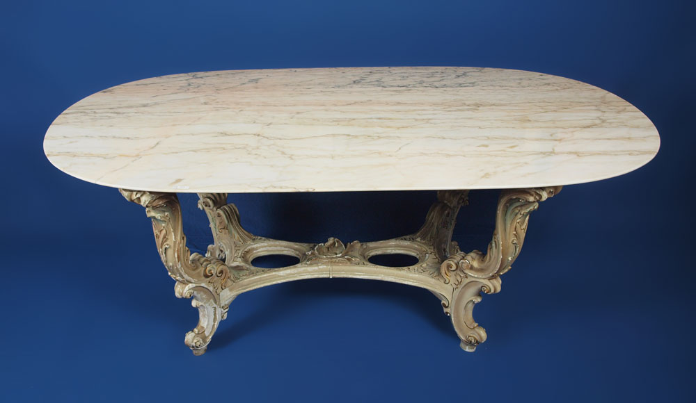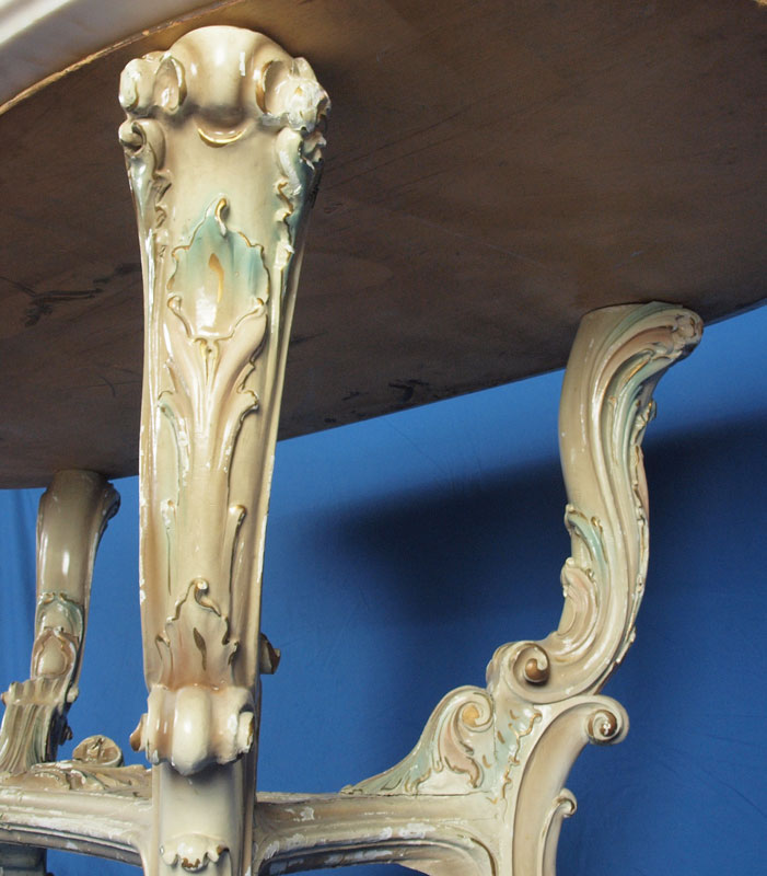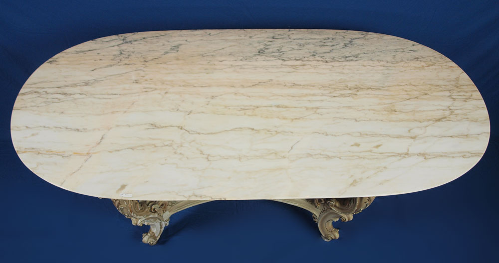 ITALIAN CARVED AND PAINTED TABLE BASE: Overall carved wave design, gesso and painted with slight blue color and gold accents, later very nice beveled white marble top, base measures approx. 29 3/4'' x 31'' x 51'', oval top approx. 76 1/2'' x 36''.