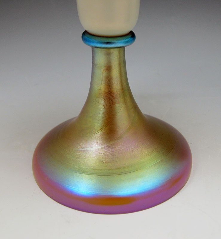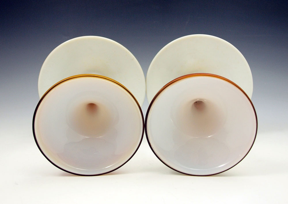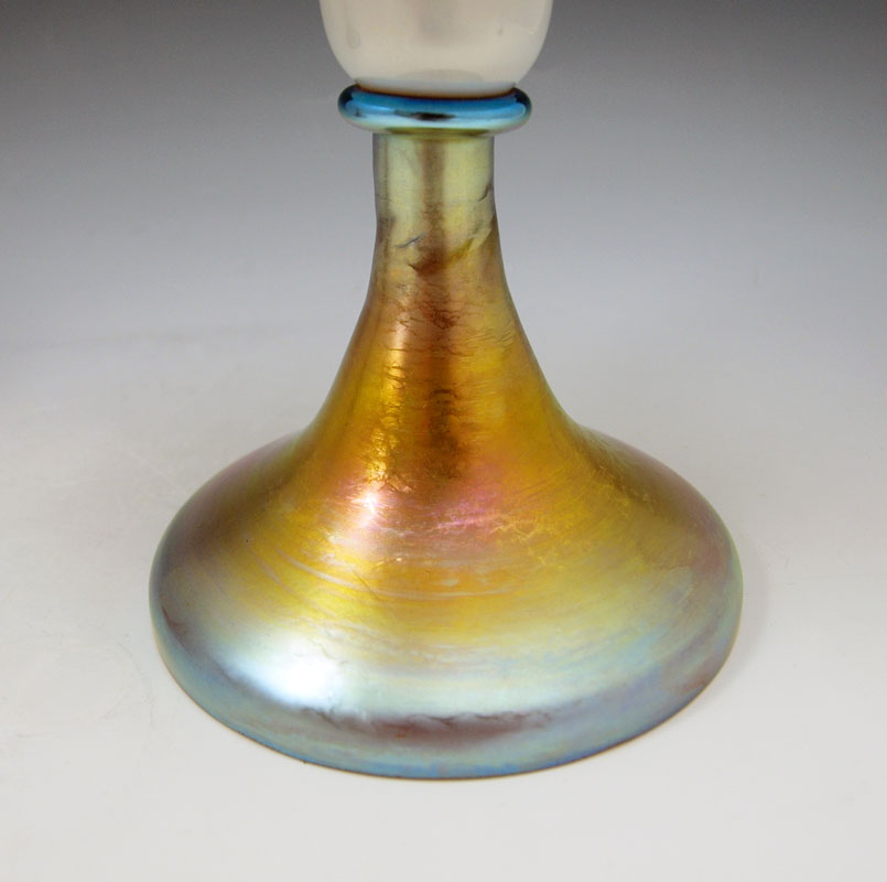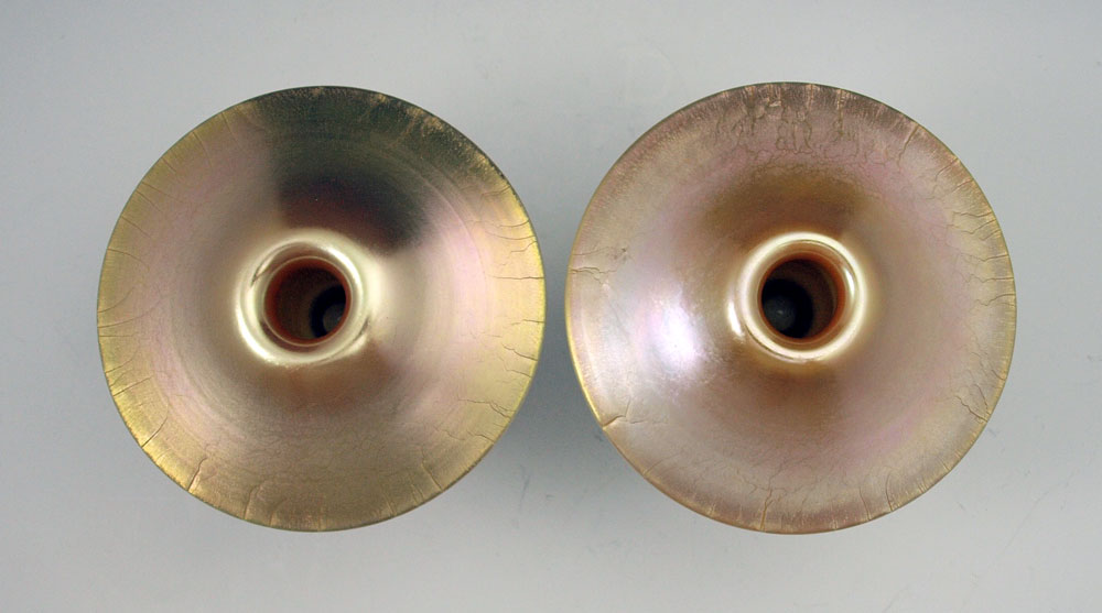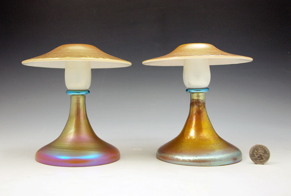 PAIR STEUBEN CALCITE CANDLESTICKS: Matched pair Calcite lined gold Aurene candle sticks. Note the blue Aurene band on the stems. Unsigned. 6 1/2'' tall, 6'' dia.