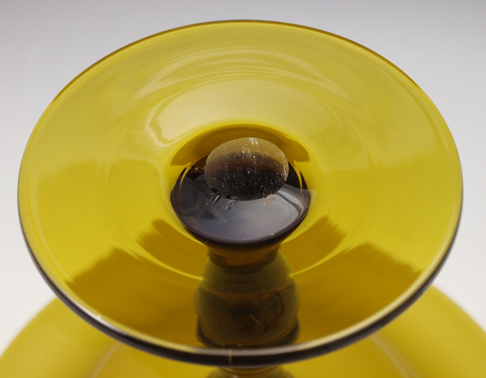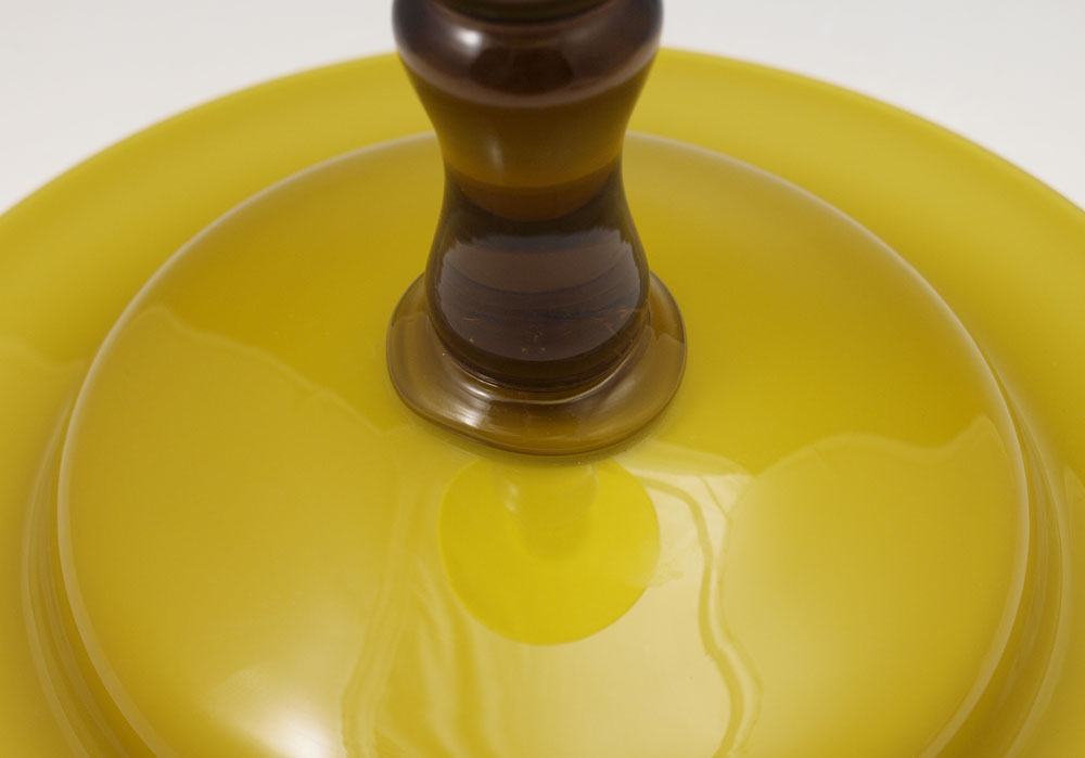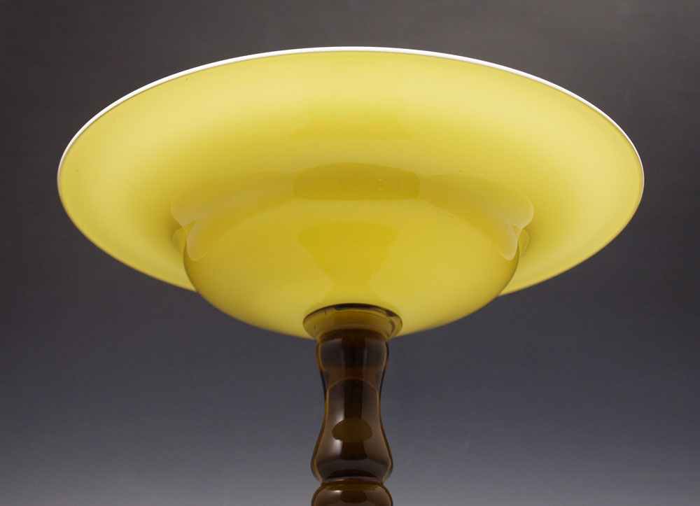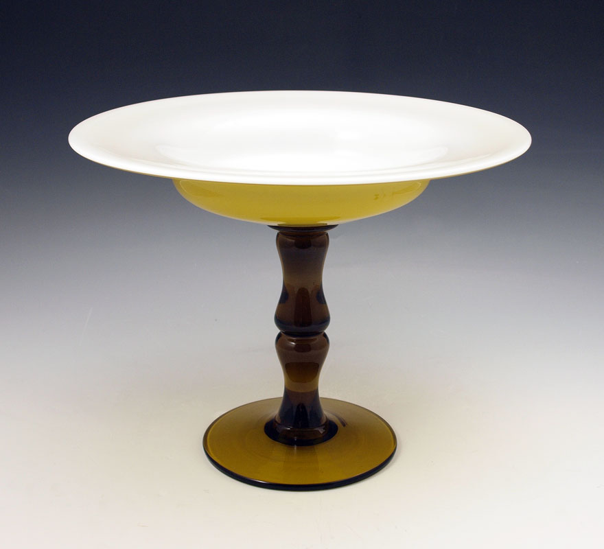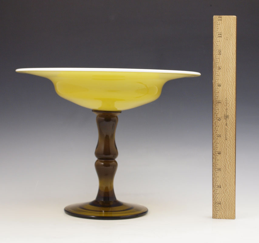 AMBER AND ALABASTER GLASS COMPOTE: Alabaster cased amber bowl on amber pedestal, unsigned, possibly Steuben. Approx. 9''h., 11 1/4'' dia.