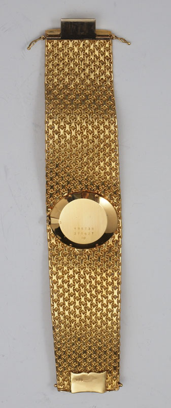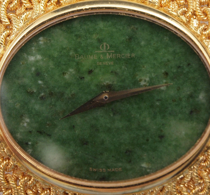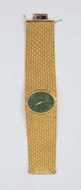 18K BAUME & MERCIER WRISTWATCH AND BAND CA. 1965: Unique oval jade dial. The 18K woven mesh band is 1 1/8 - 1 1/4'' wide. Swiss movement is in good running order. 6 1/2'' length. Weight 103.3 grams overall.