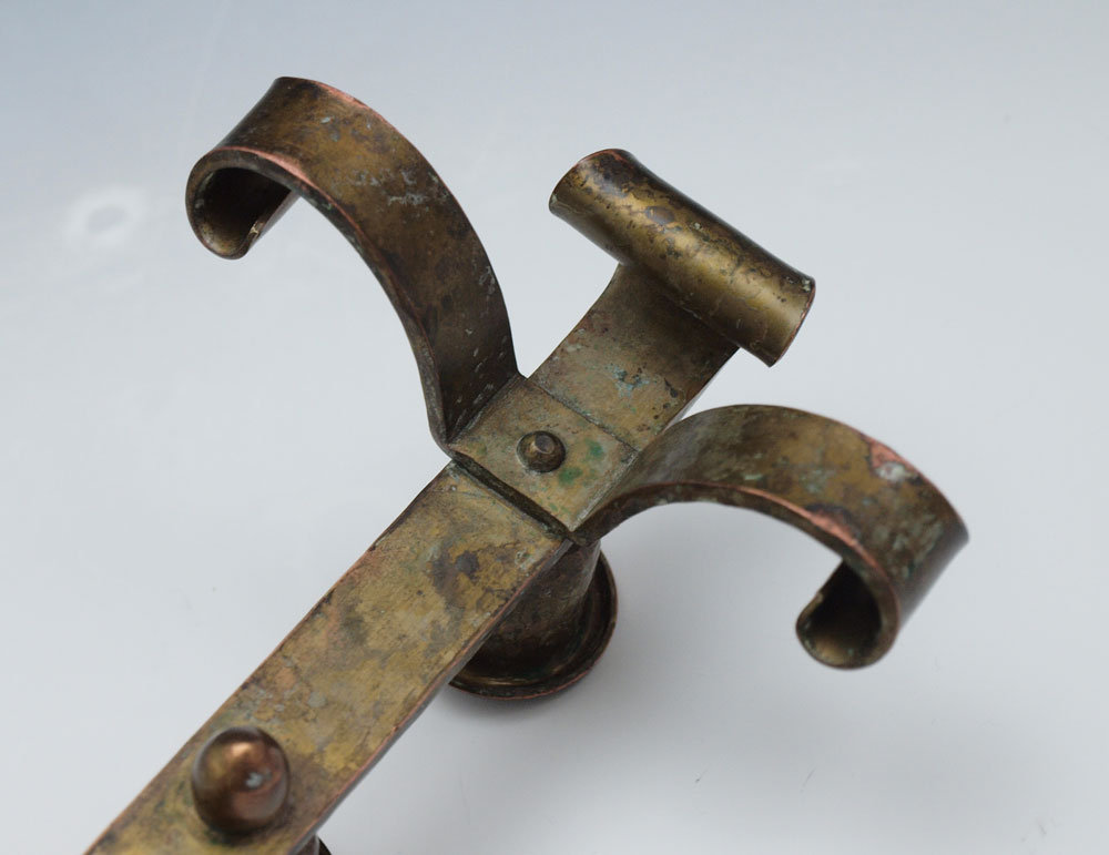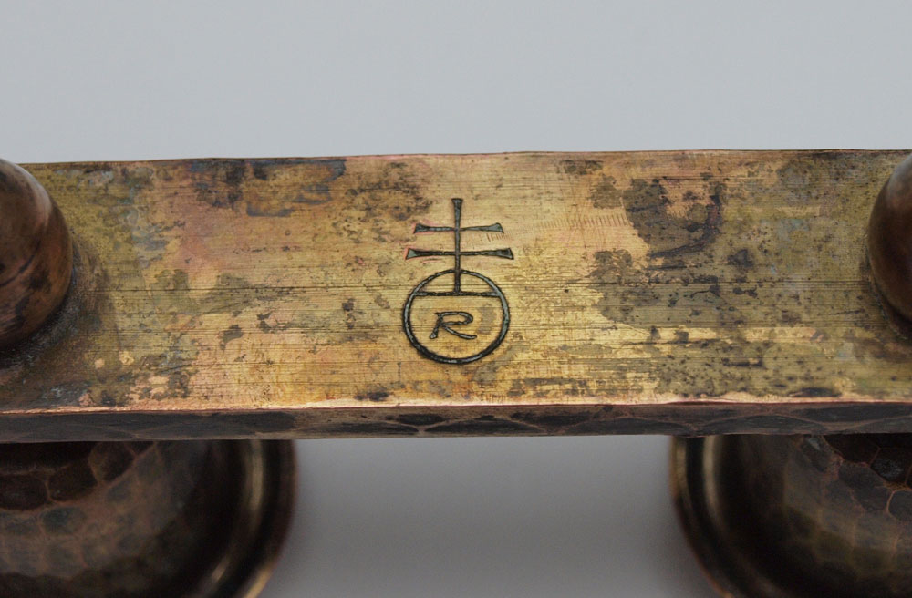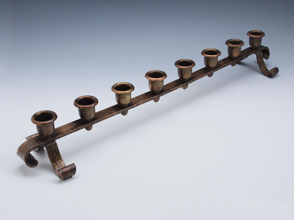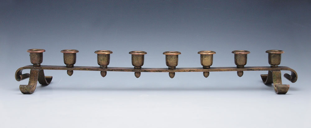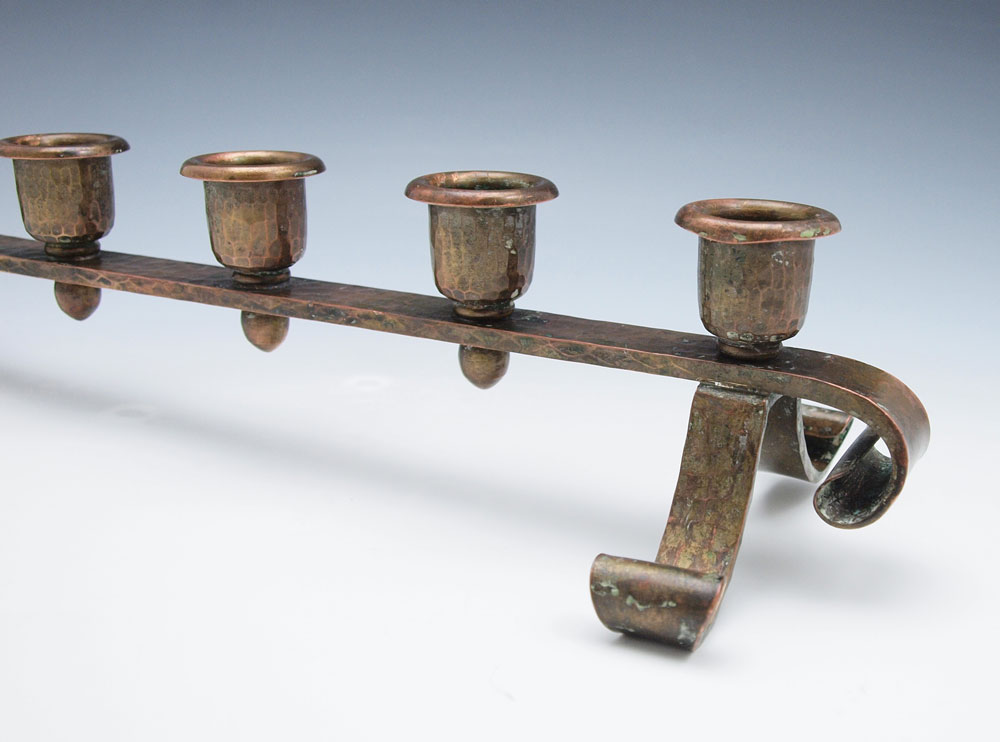 ROYCROFT STRAIGHT EIGHT COPPER CANDLE STAND CA. 1915-1925: Eight light straight bar candle holder, 20.5'' length, 2.75'' tall.