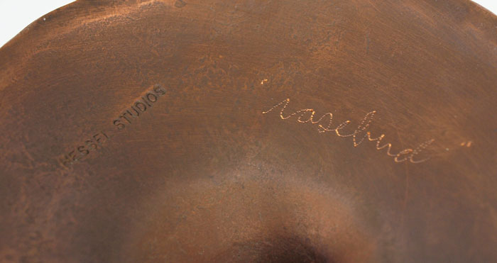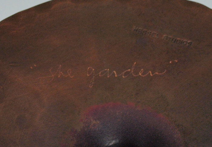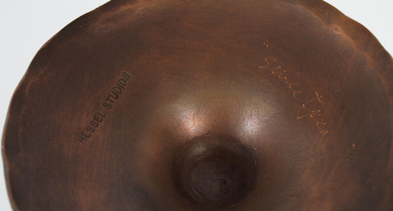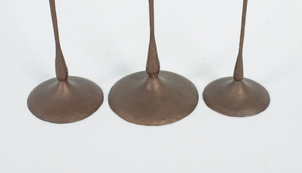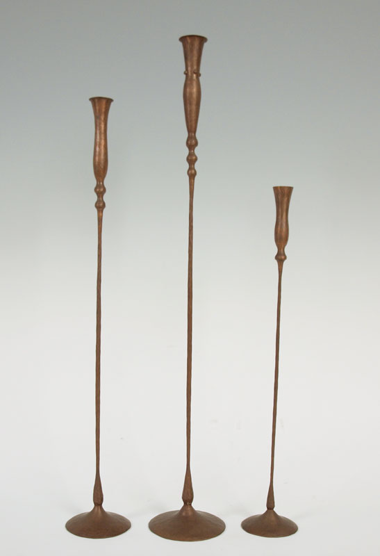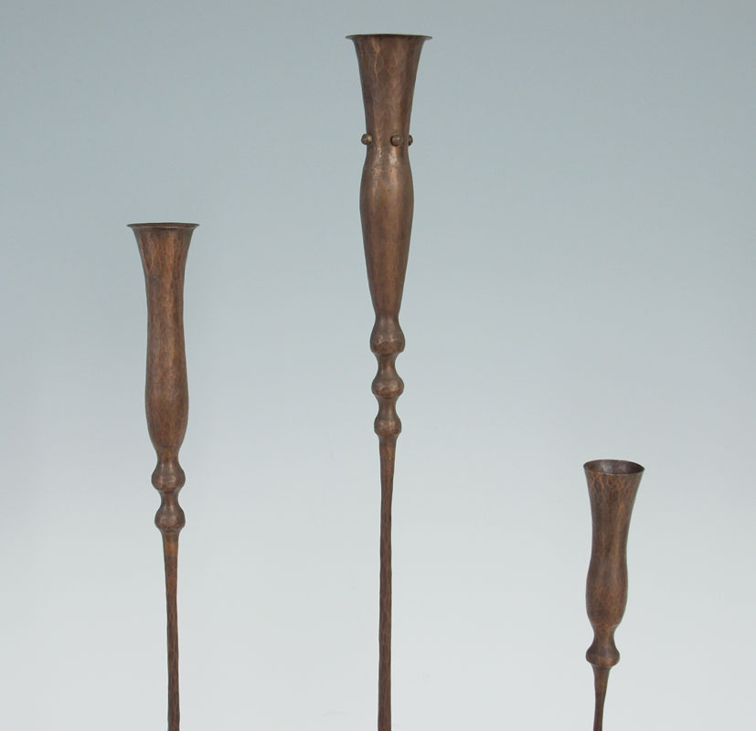 3 HESSEL STUDIOS COPPER CANDLES AND BUD VASE: Hand hammered copper with impressed Hessel Studios stamp on bases. Each titled differently ''Sweetpea'', ''Rosebud'', ''The Garden''. Tallest measures 29 3/4'' h. x 5 1/2''.