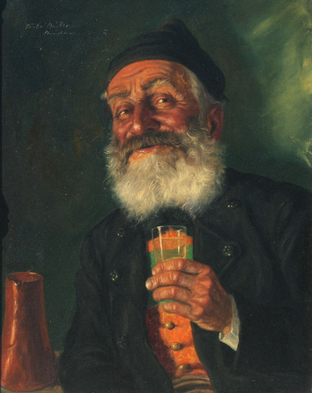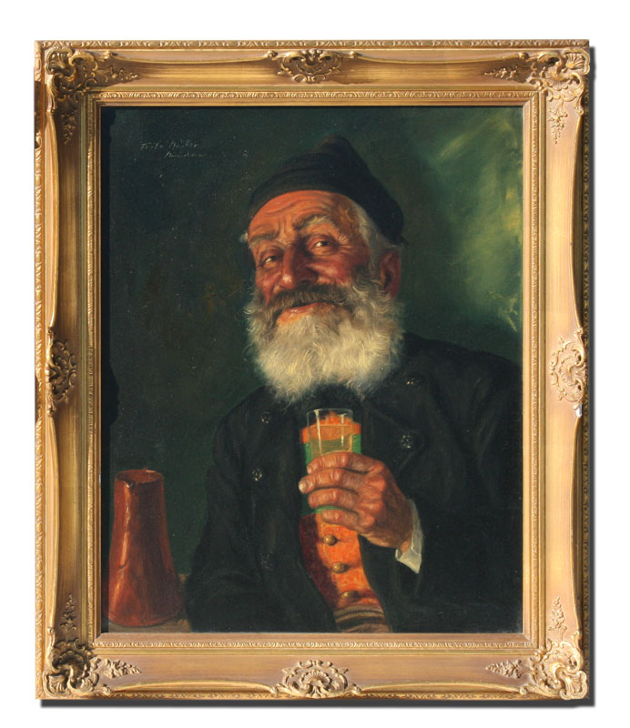 MULLER, Fritz, (German, 1867-1926): Bearded Man Holding Beer Glass with Pitcher on Table, OIL/Canvas, 19 3/4'' x 15 3/4'', signed, marked Munchen, pierce carved and gilded frame, 24 1/2'' x 20''.