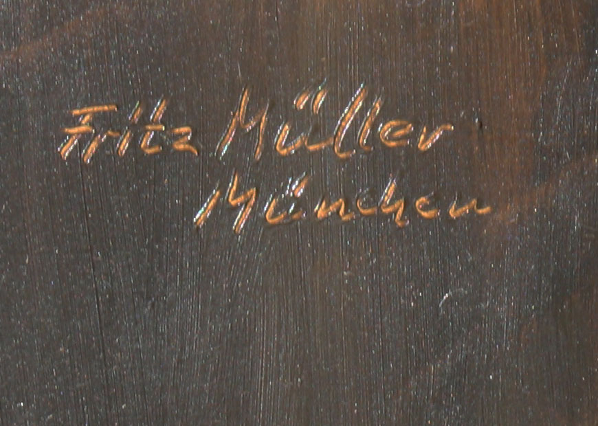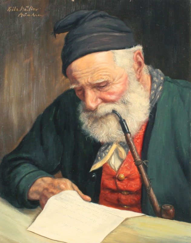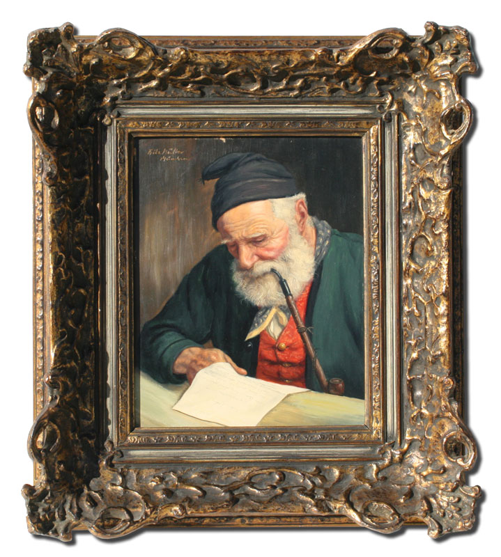 MULLER, Fritz, (German, 1867-1926): Bearded Man Seated Smoking Pipe and Reading, OIL/Masonite, 12'' x 9 1/2'', signed, marked Munchen, pierce carved and gilded frame, 20'' x 17''.
